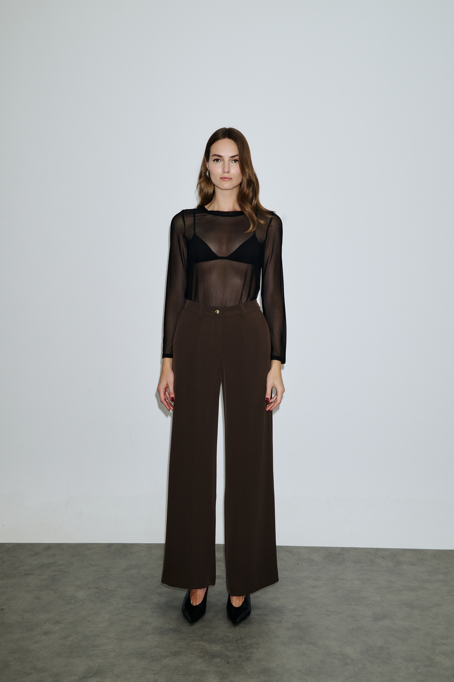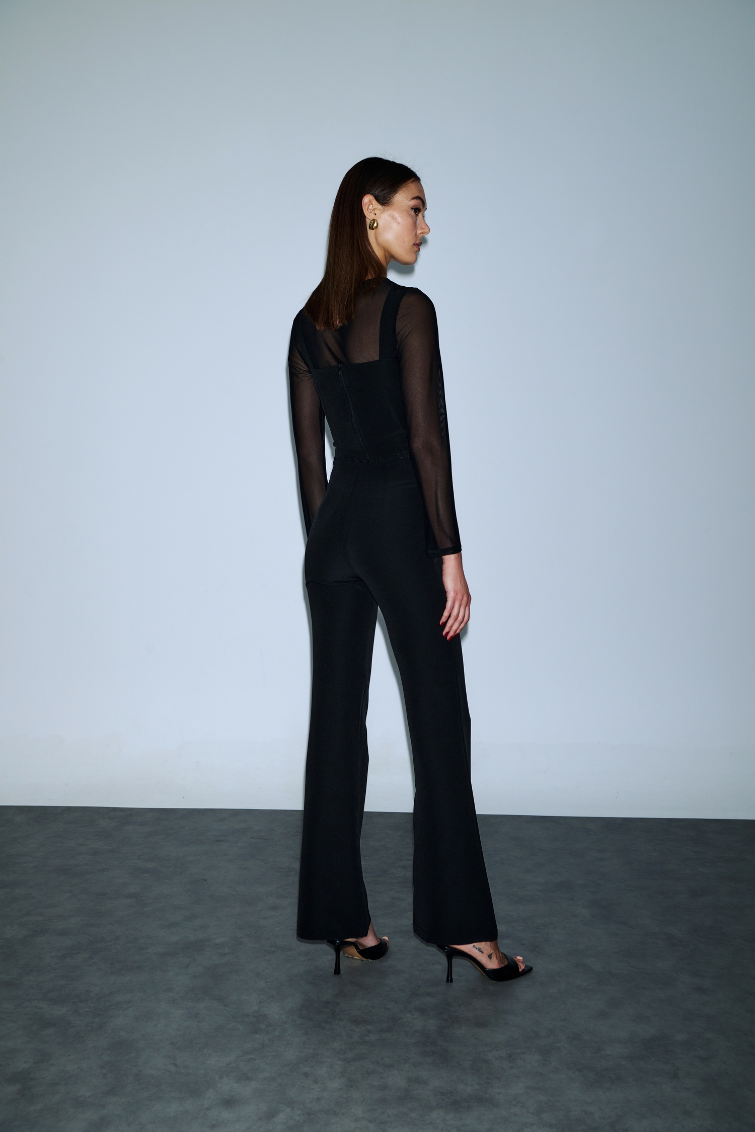 Mπλούζα με διάφανες λεπτομέρειες σε tulle που δημιουργούν elegant contrast. Τα μακριά μανίκια συνδυάζονται με στενή εφαρμογή που καταλήγει σε ψηλόμεσα παντελόνια για αρμονικό σύνολο.
