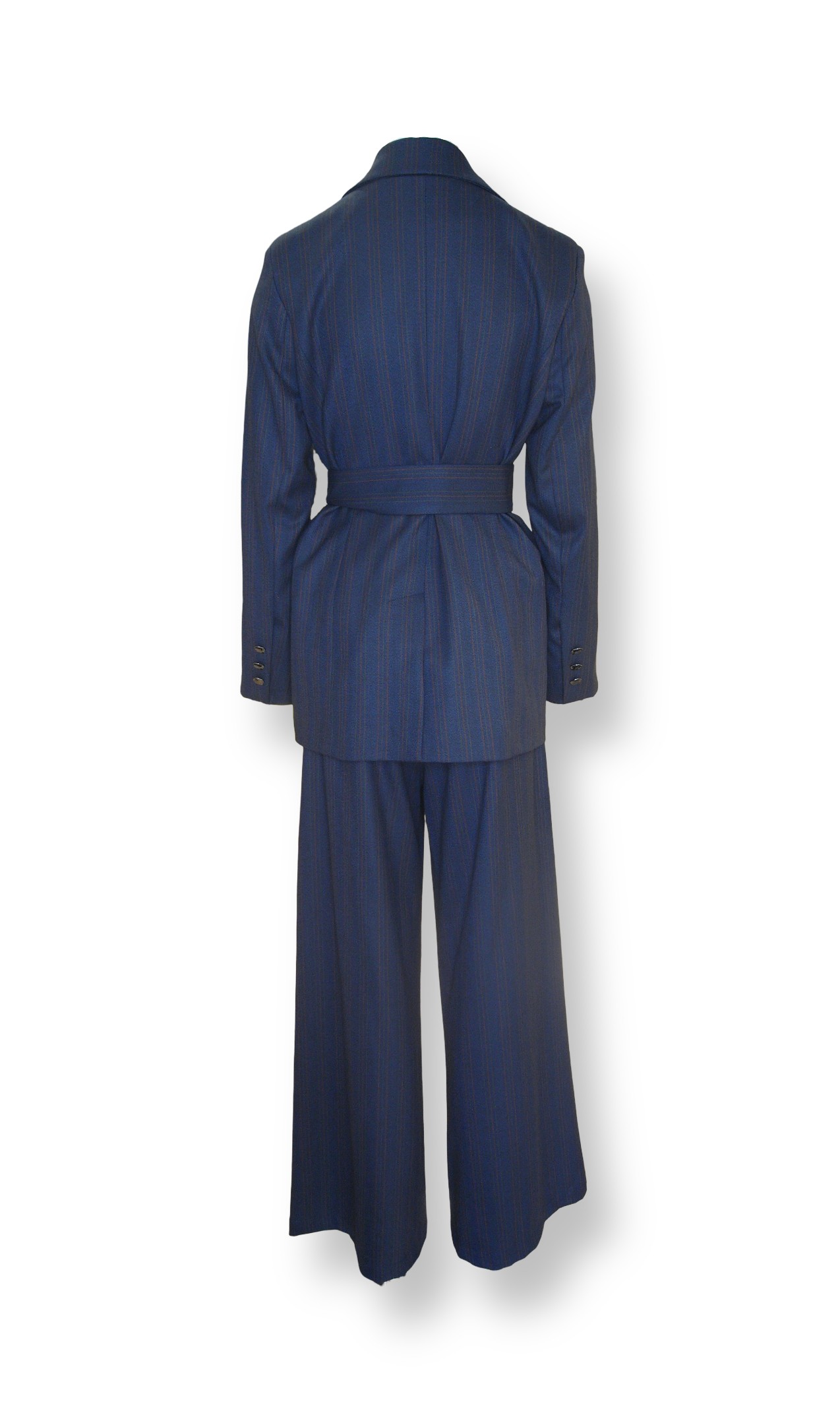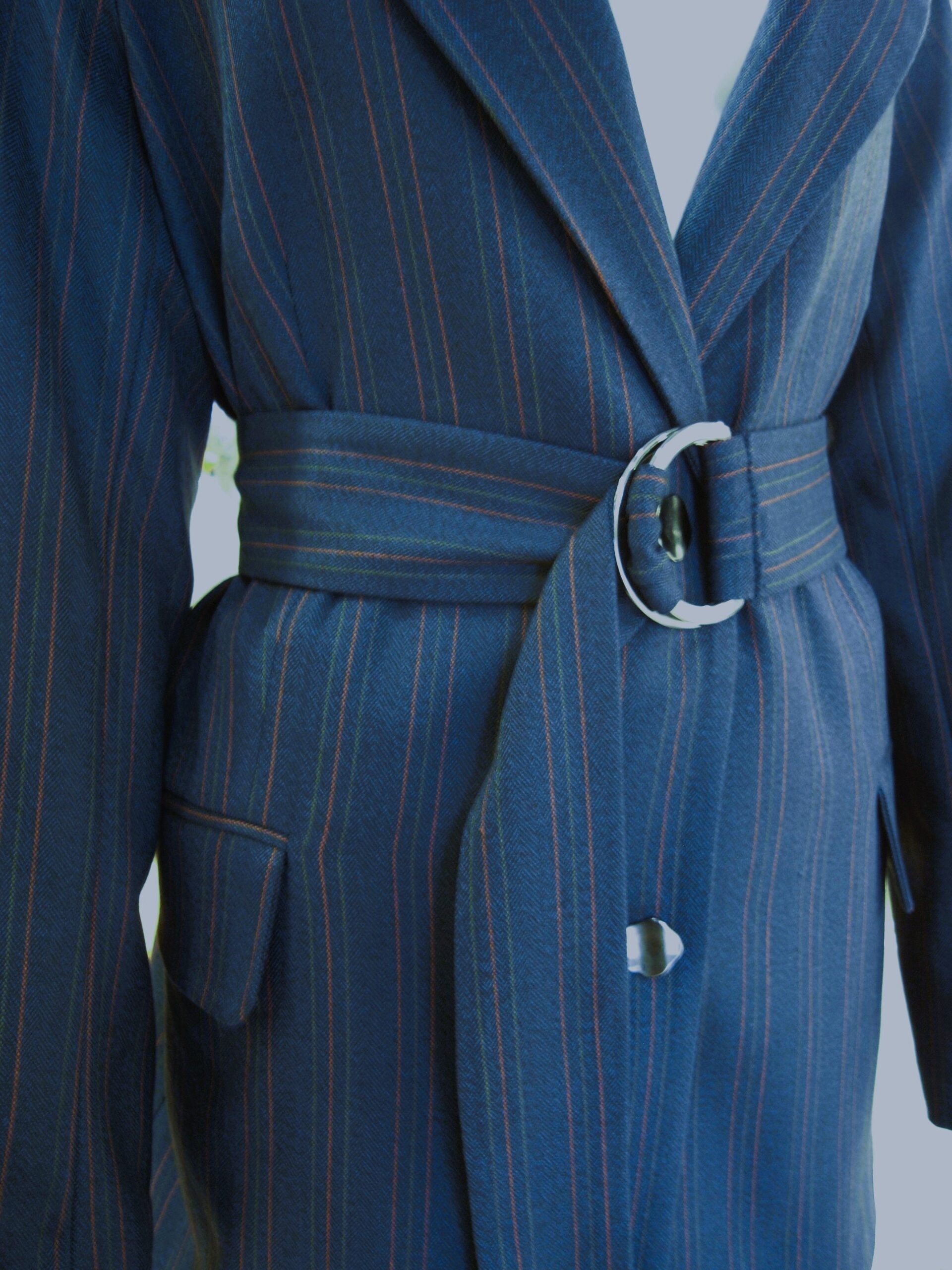 Σακάκι μεσάτο με κάθετη ρίγα. Κλείσιμο με κουμπιά. Πέτο και γιακά. Τσέπες με καπάκι. Διαθέτει ζώνη του ίδιου υφάσματος.
