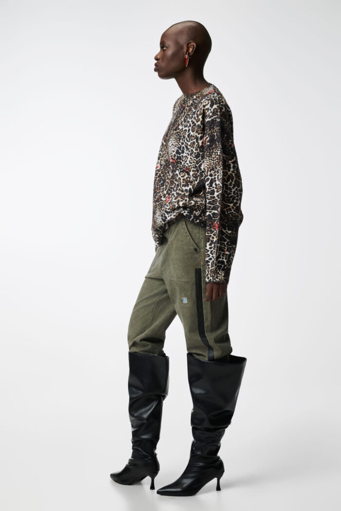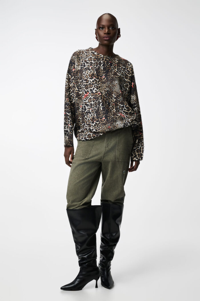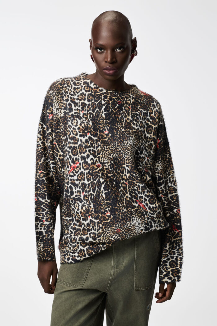 Πλεκτό με μια άγρια πλευρά. Αυτό είναι το πουλόβερ Amphitrite. Διαθέτει ζακάρ με λεοπάρ τύπωμα σε λαδί χρώμα και απαλή βάση από ανακυκλωμένο νήμα. Έχει άνετο oversized σχέδιο με στρογγυλή λαιμόκοψη και μακριά μανίκια. Είναι το τέλειο ευκολοφόρετο κομμάτι καθώς μπαίνουμε στο φθινόπωρο – συνδυάστε το με μια δερμάτινη φούστα ή μια τζιν μίντι φούστα και είστε έτοιμες και στιλάτες.