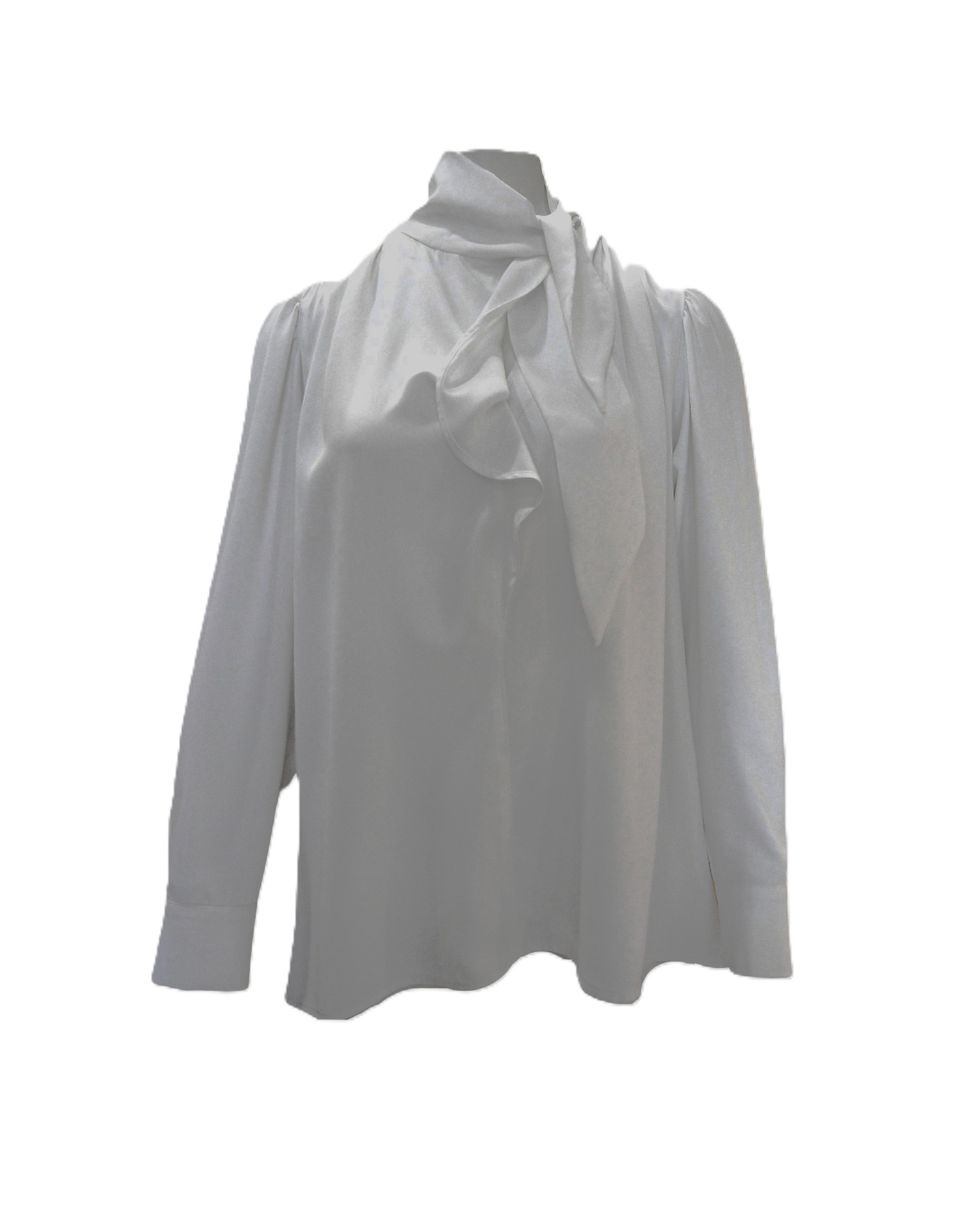 Μπλούζα με δέσιμο στο λαιμό και μικρές πιέτες που ξεκινούν απ το ύψος του ώμου. Μακριά μανίκια με διακοσμητικό κουμπί στις μανσέτες.