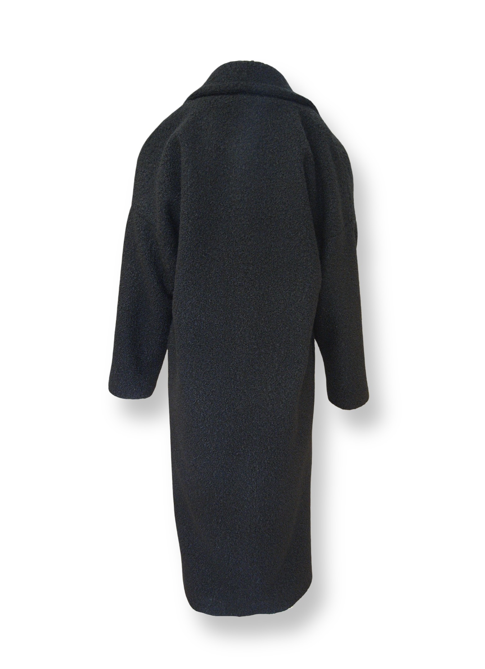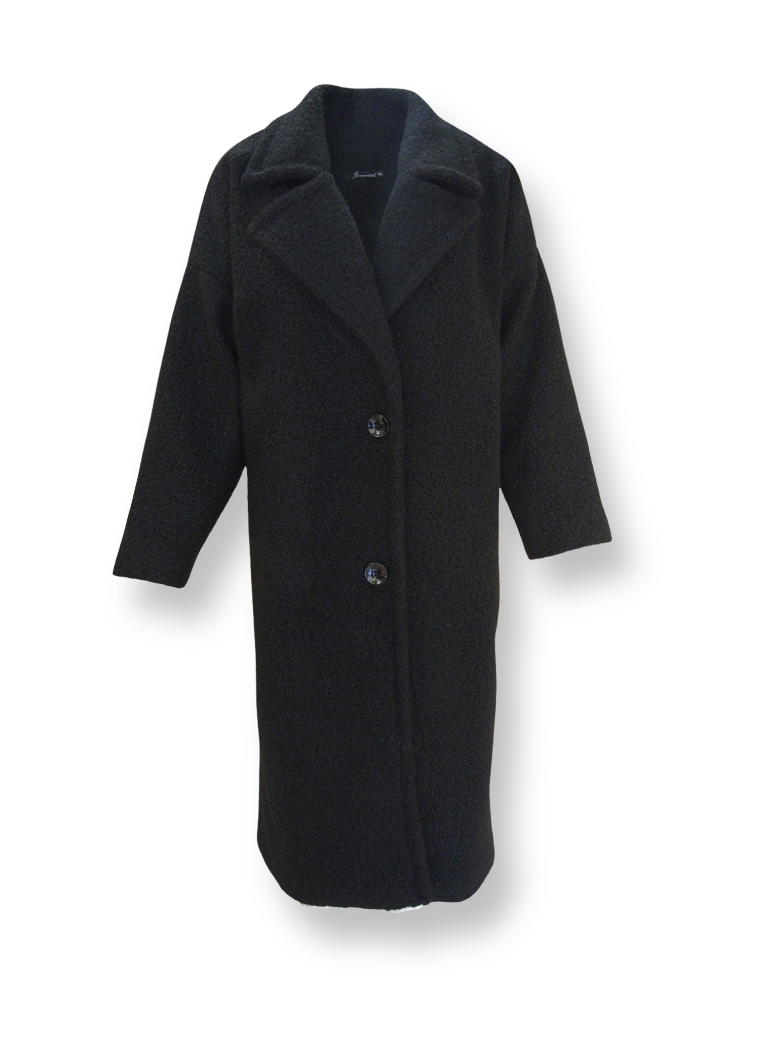 Φαρδύ παλτό με γιακά με πέτο και μακρύ μανίκι. Πλαϊνές κρυφές τσέπες. Κλείσιμο μπροστά με κουμπιά.