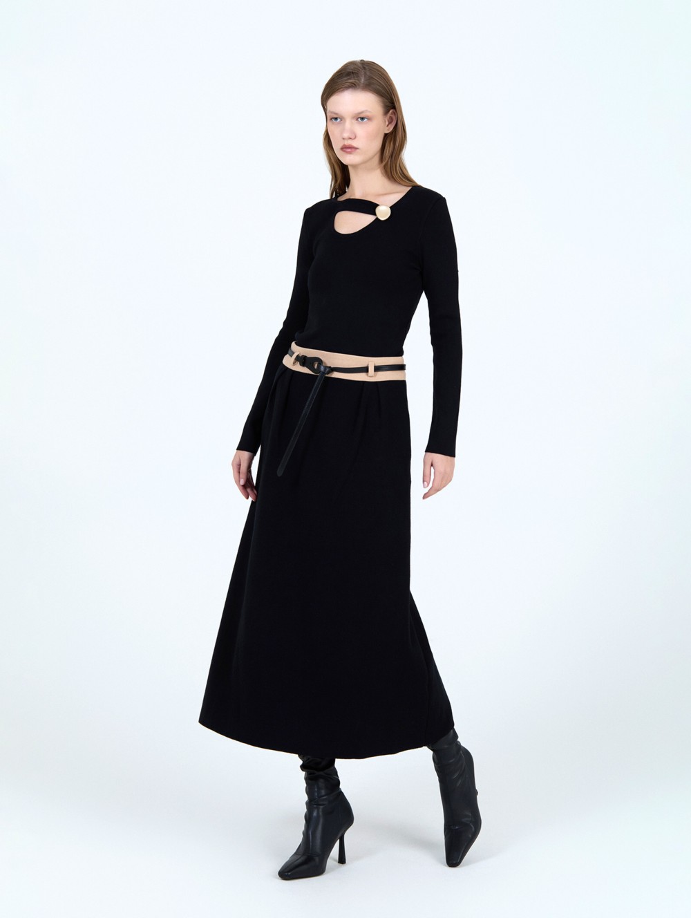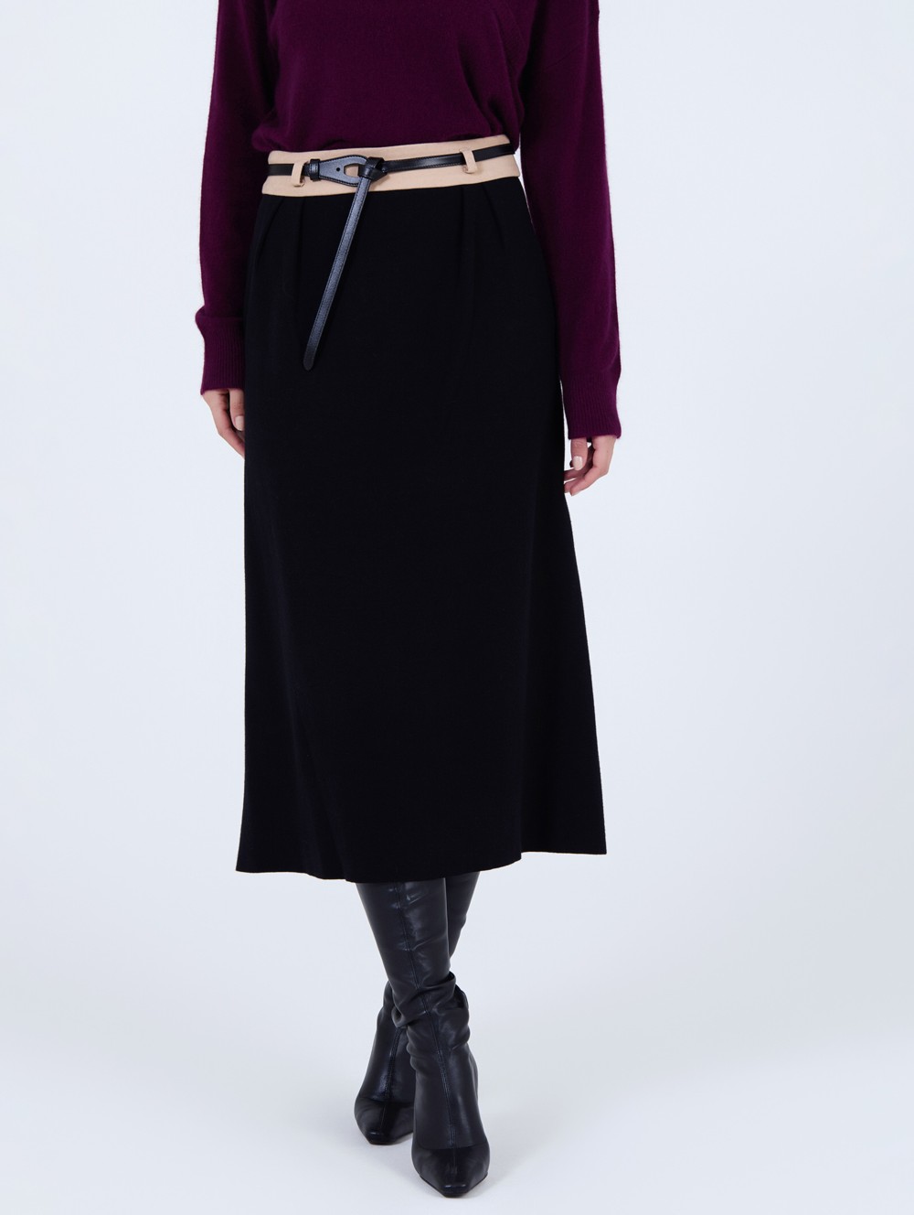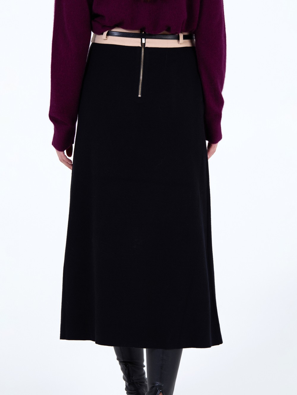 Φούστα μίντι, πένσιλ. Δίχρωμη, με πλεκτή φούστα και ζώνη από ύφασμα twill. Πλαϊνές τσέπες. Ζώνη από δερματίνη.
