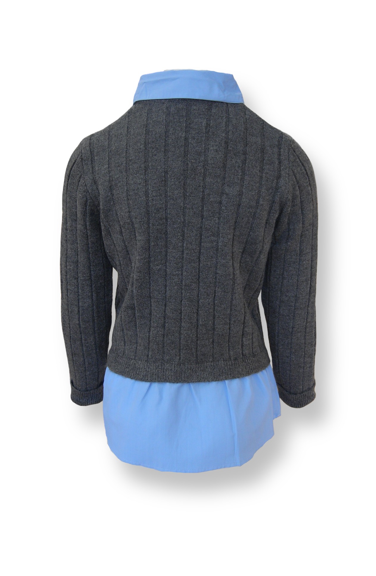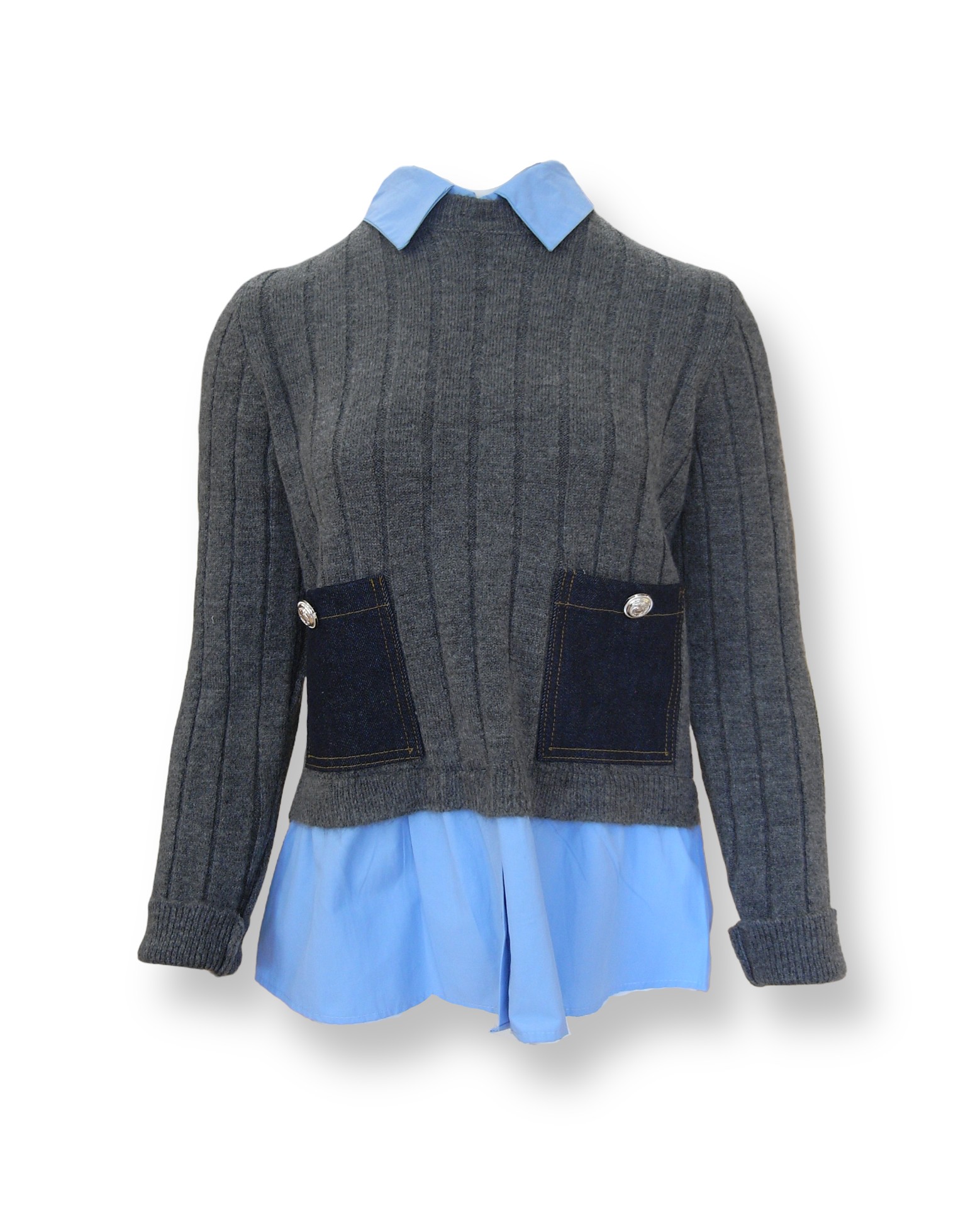 Πουλόβερ με ενσωματωμένο γιακά πουκαμίσου και τελείωμα πουκαμίσου. Εμφανείς τσέπες μπροστά denim.
