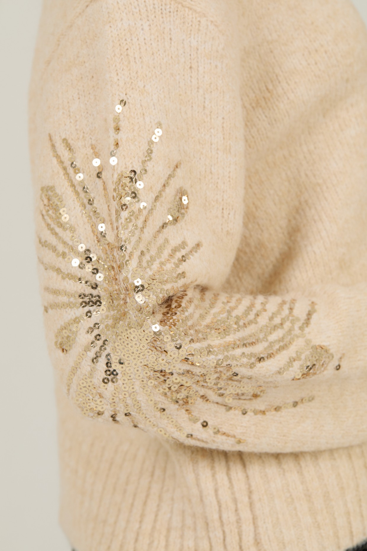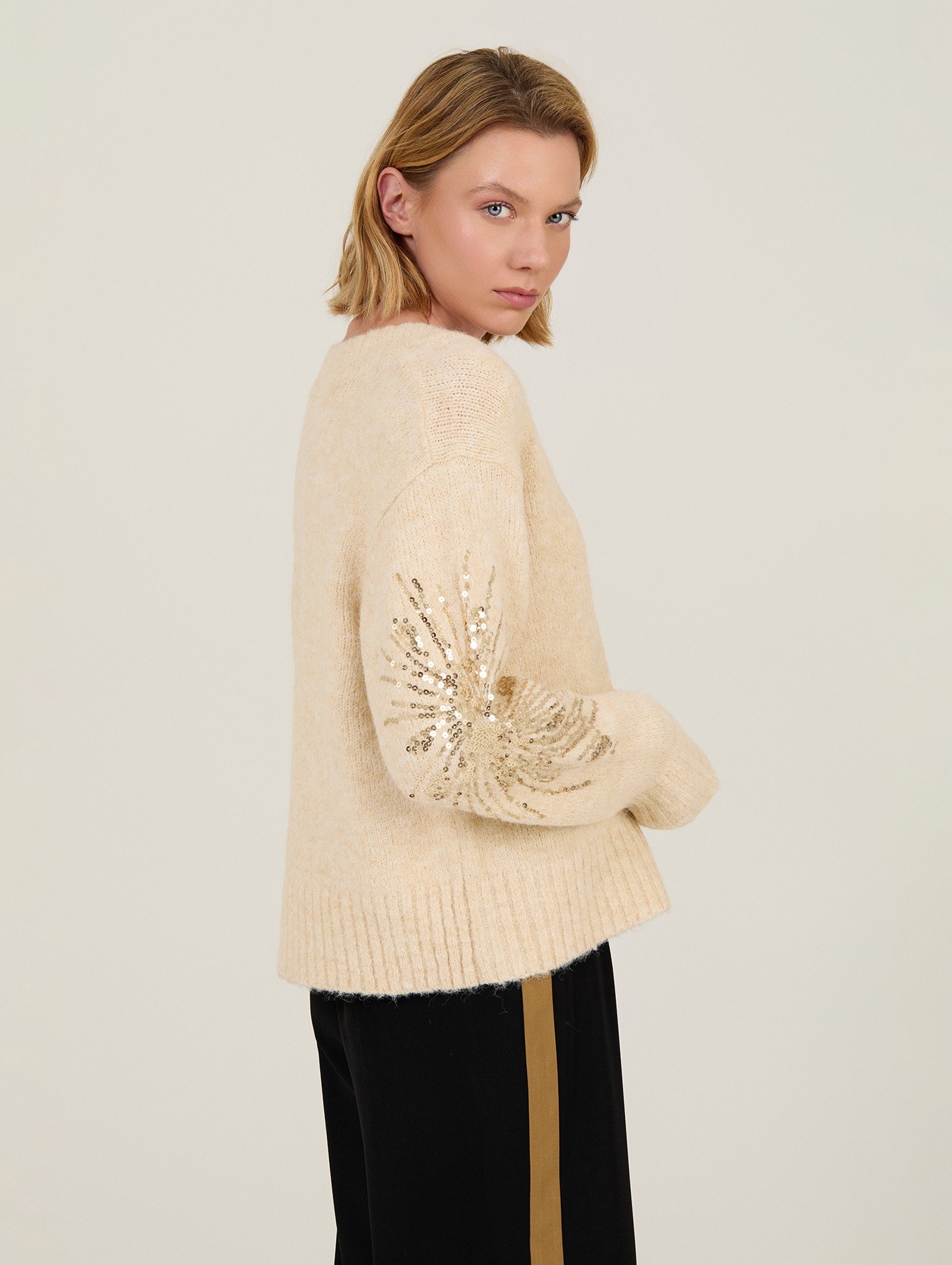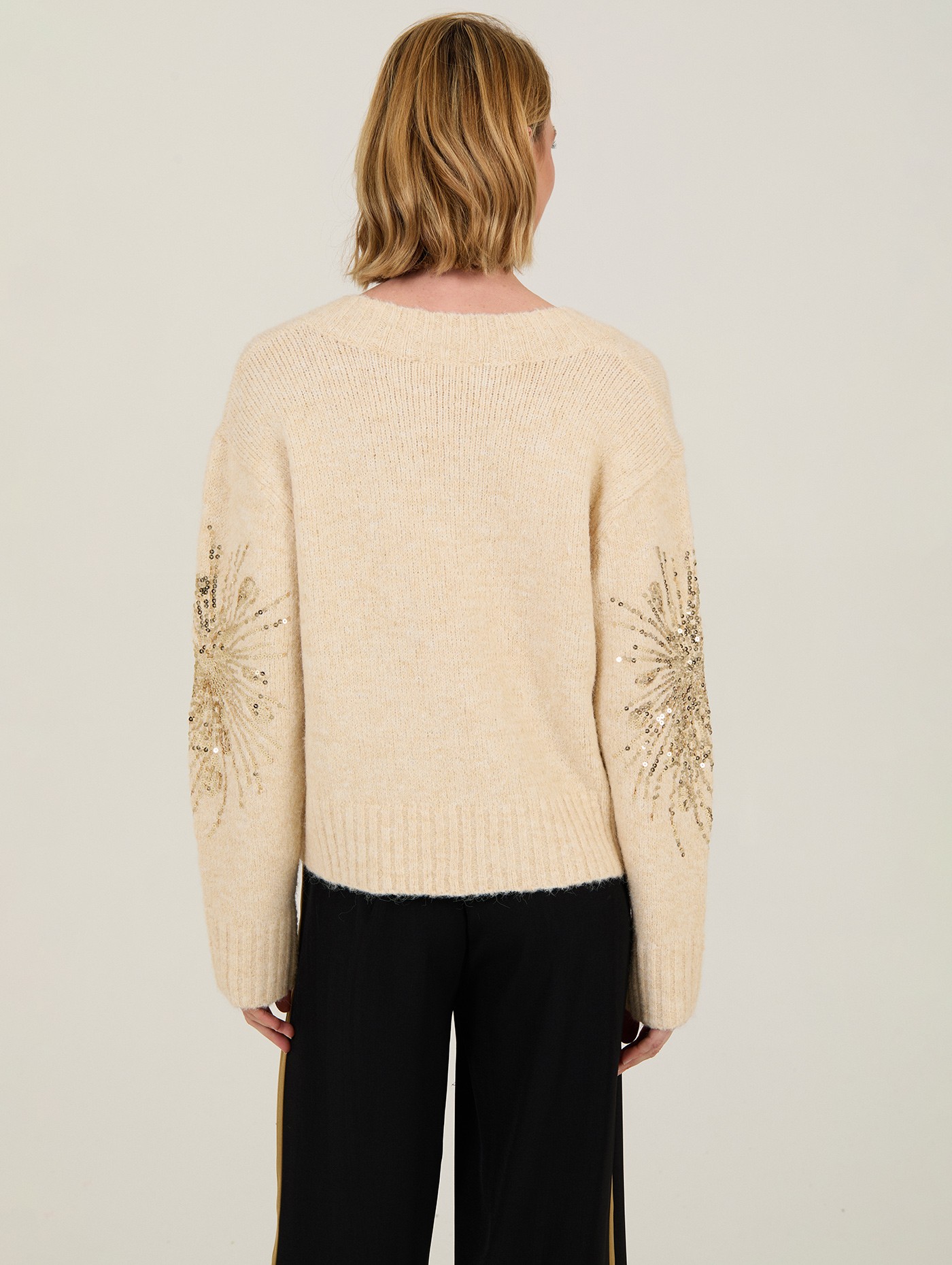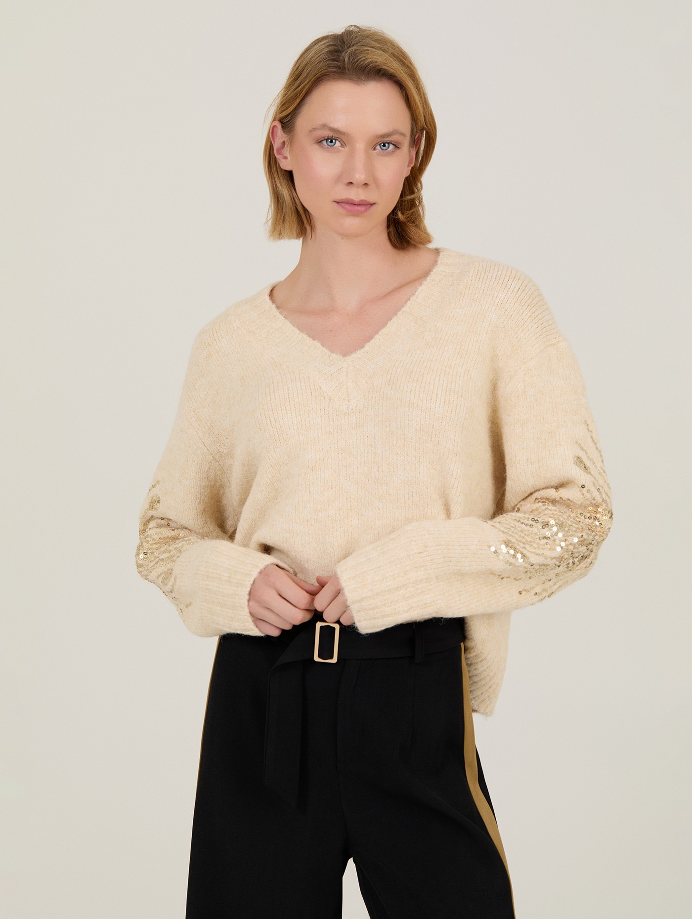 Πλεκτό πουλόβερ από μάλλινο ύφασμα. Κέντημα με χρυσές παγιέτες στα μανίκια. Λαιμόκοψη V. Φαρδιά ριμπ ύφανση στο γιακά, τις μανσέτες και το στρίφωμα.