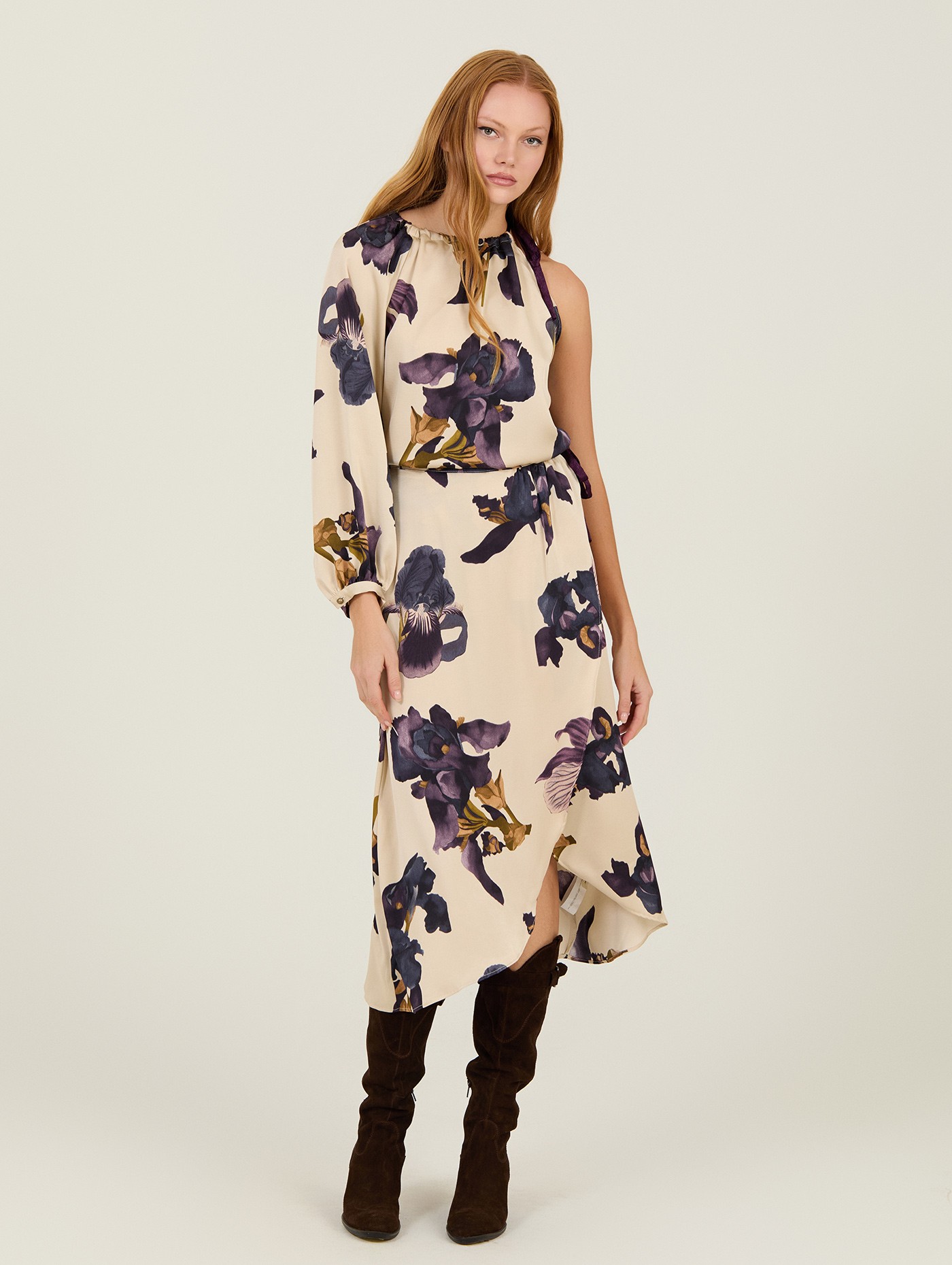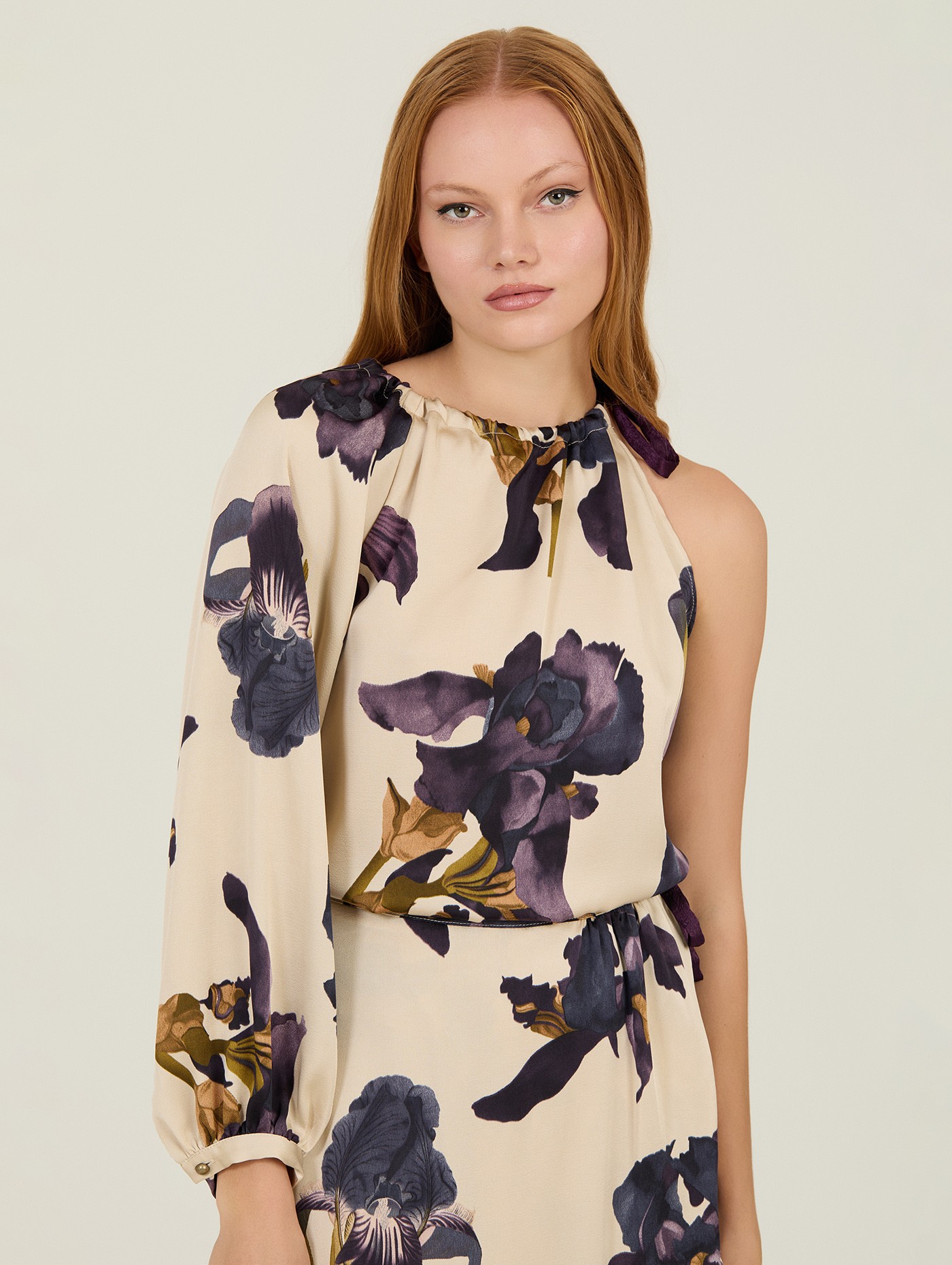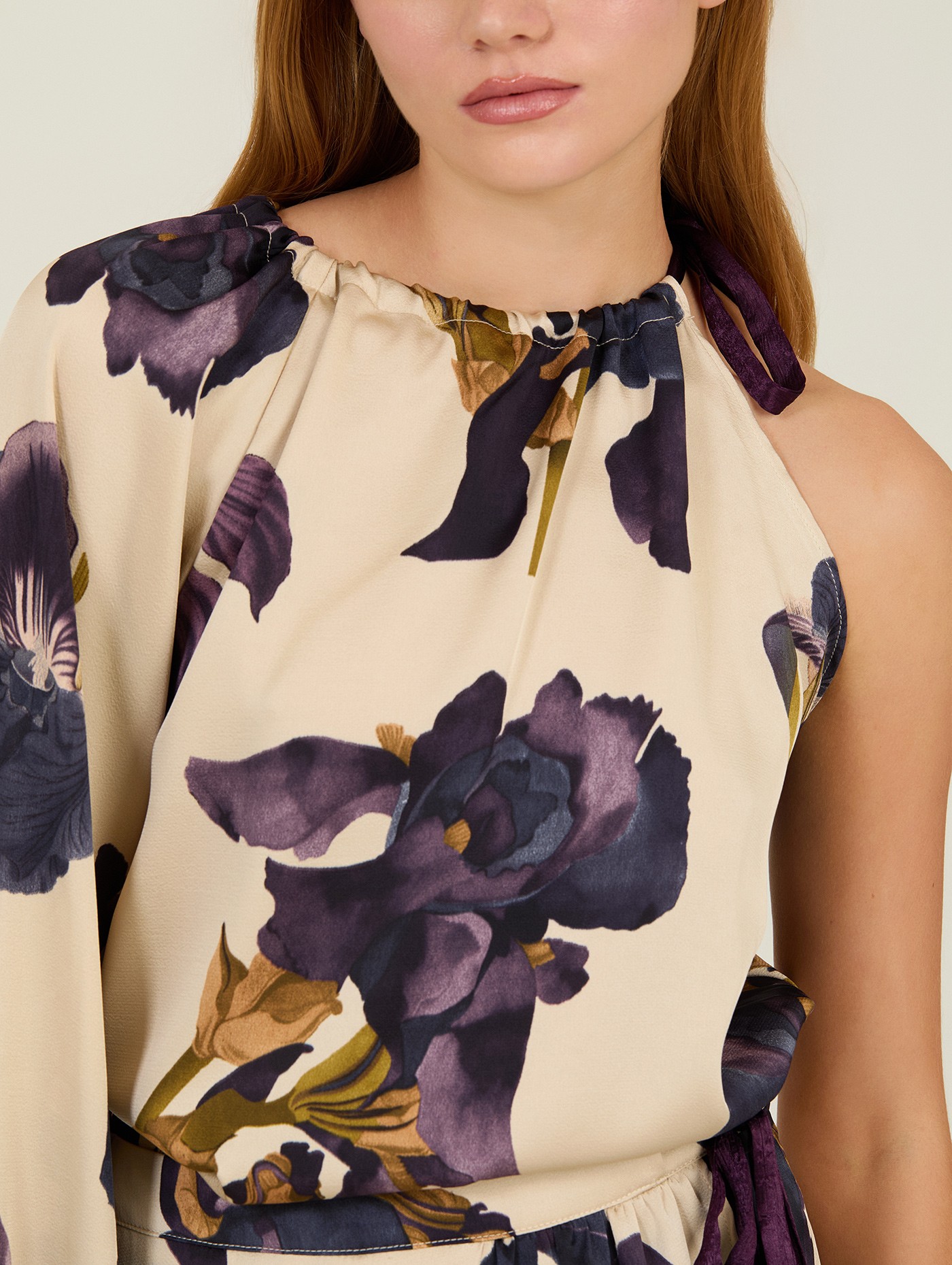 Ασύμμετρη σατέν μπλούζα με φλοράλ τύπωμα. Ρυθμιζόμενη λαιμόκοψη με φιόγκο. Φουσκωτά μανίκια. Φιόγκος σε αντίθεση.