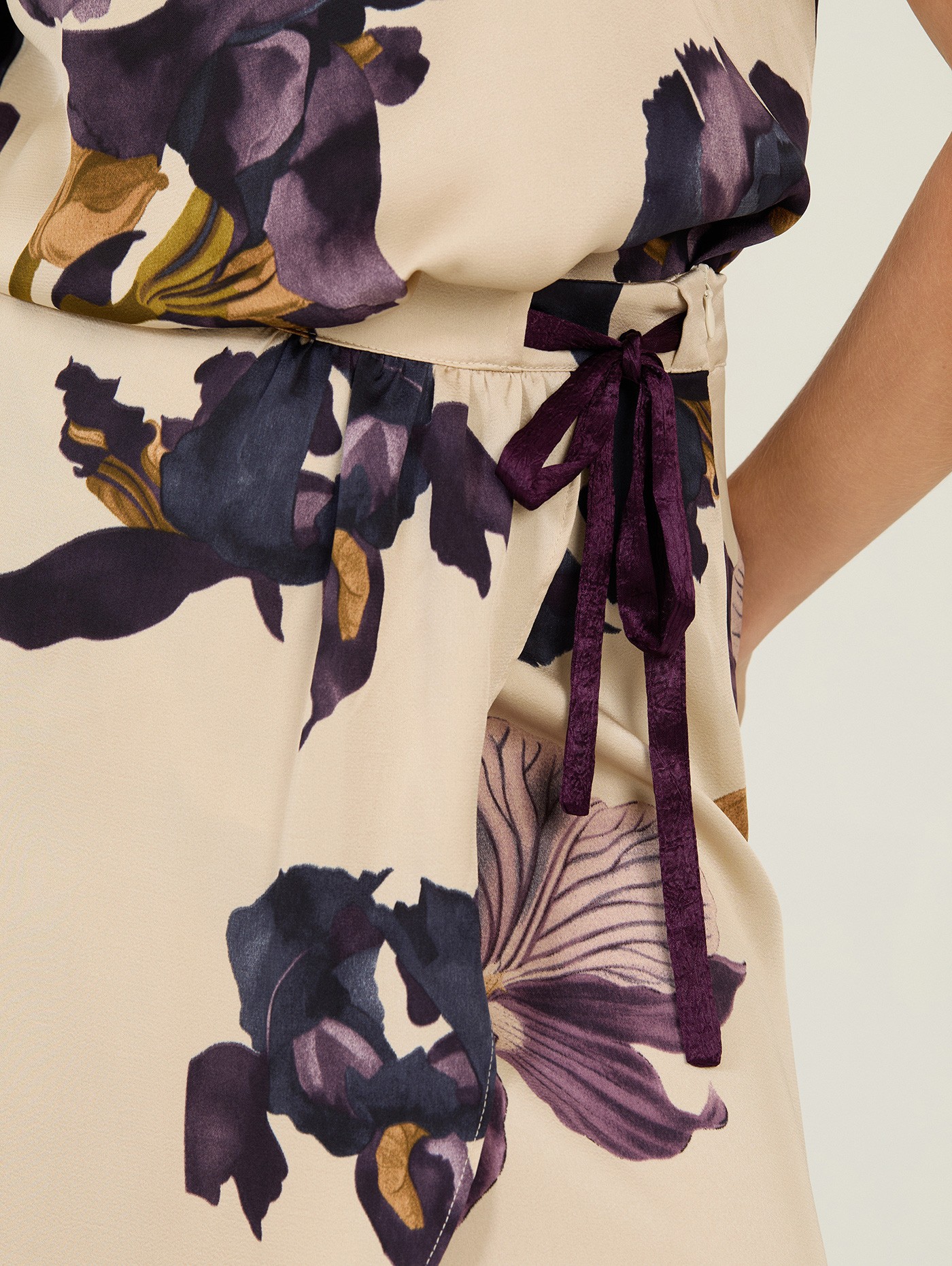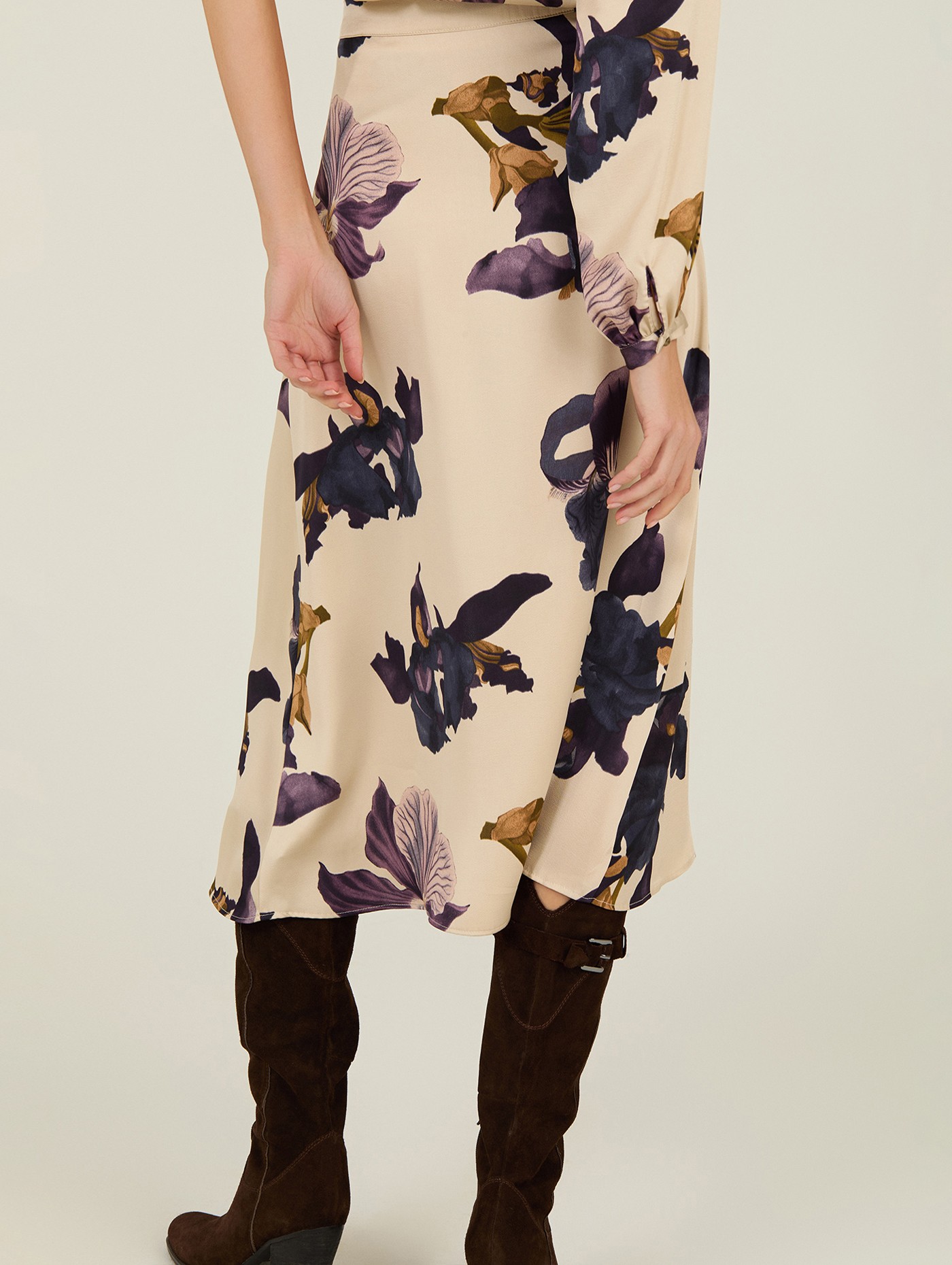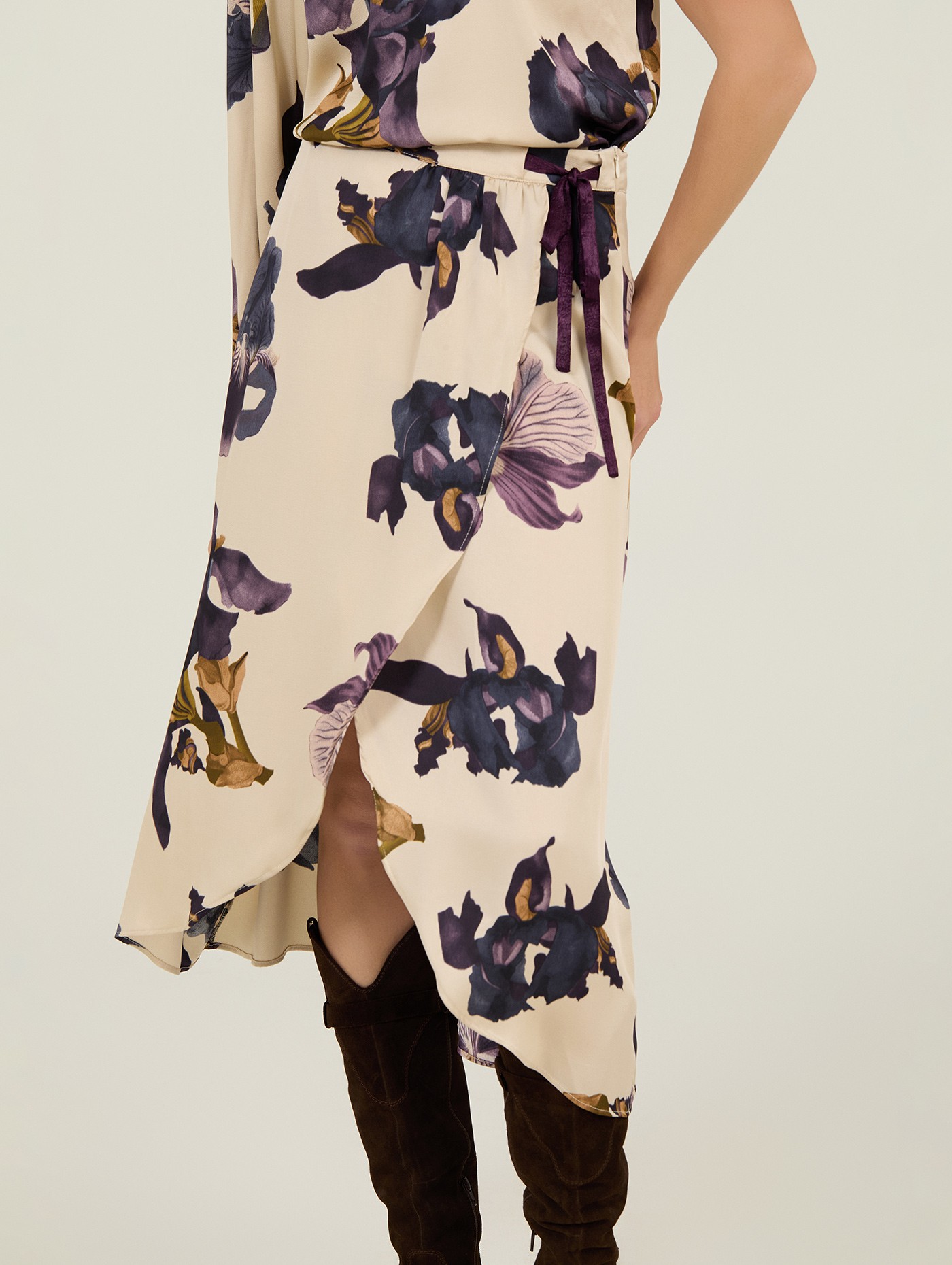 Μακριά σατέν φούστα. Σατέν ύφασμα με φλοράλ τύπωμα. Πλαϊνό σκίσιμο. Ζώνη με φιόγκο σε αντίθεση. Αόρατο πλαϊνό φερμουάρ.