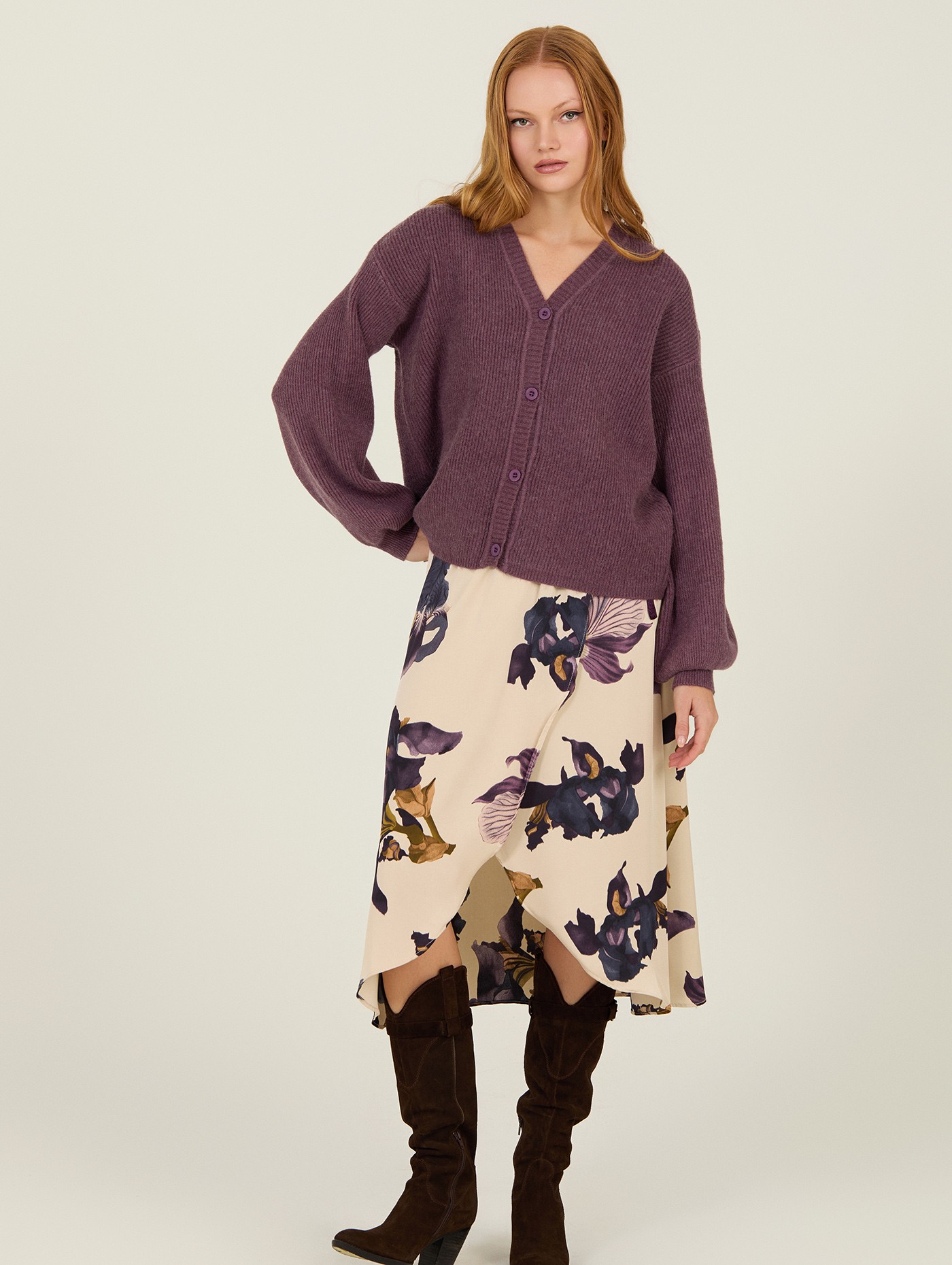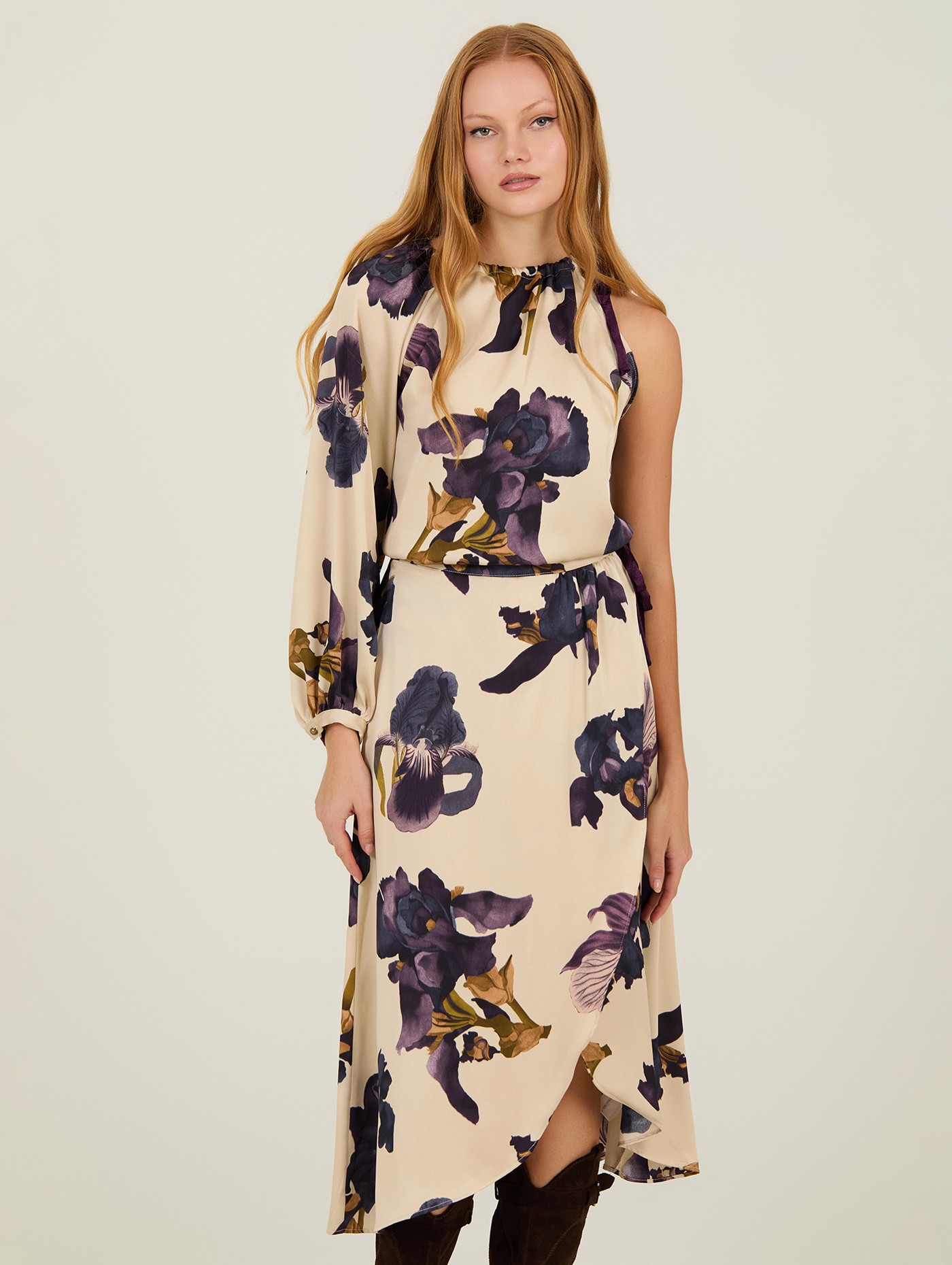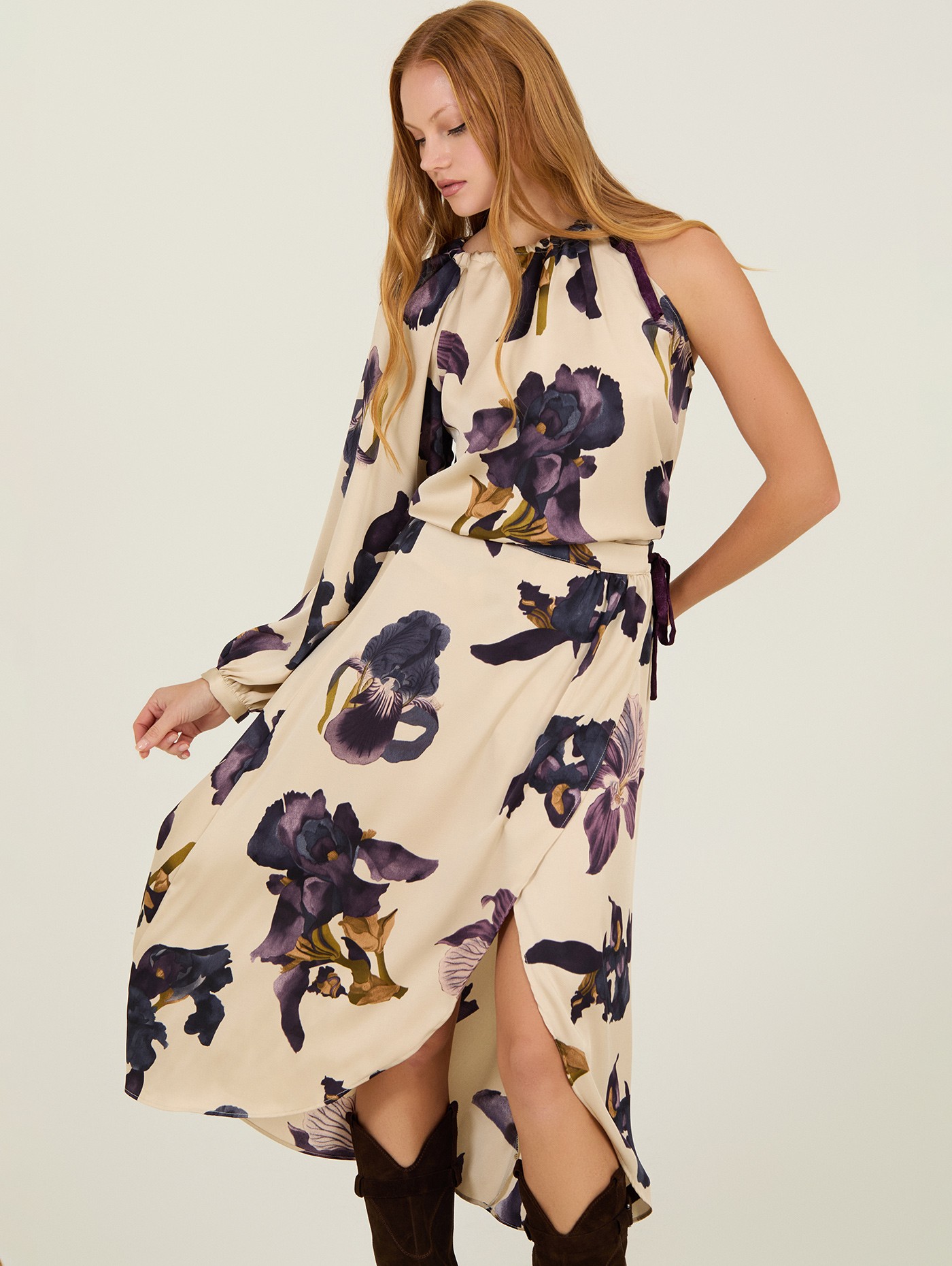 Μακριά σατέν φούστα. Σατέν ύφασμα με φλοράλ τύπωμα. Πλαϊνό σκίσιμο. Ζώνη με φιόγκο σε αντίθεση. Αόρατο πλαϊνό φερμουάρ.
