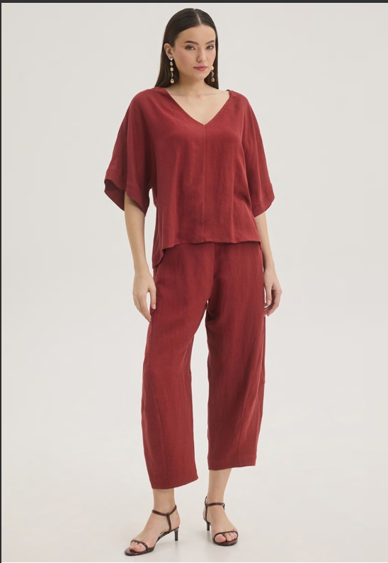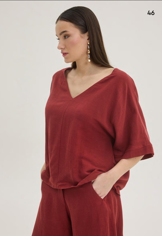 Σύνολο από ανάλαφρο ύφασμα και άνετη εφαρμογή. Αποτελείται από μπλούζα με v λαιμόκοψη και παντελόνι τύπου σαλβάρι με λάστιχο στο πίσω μέρος του.