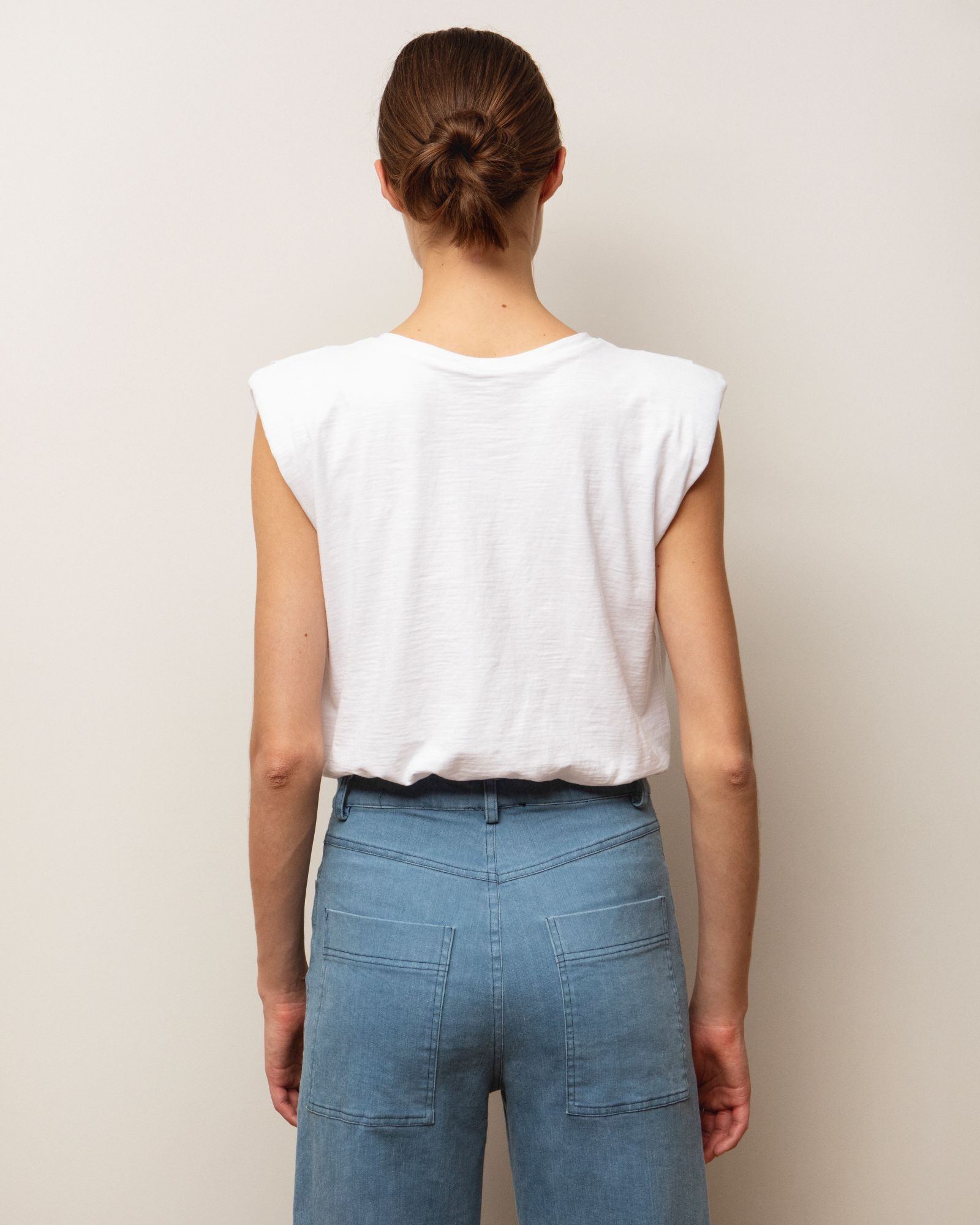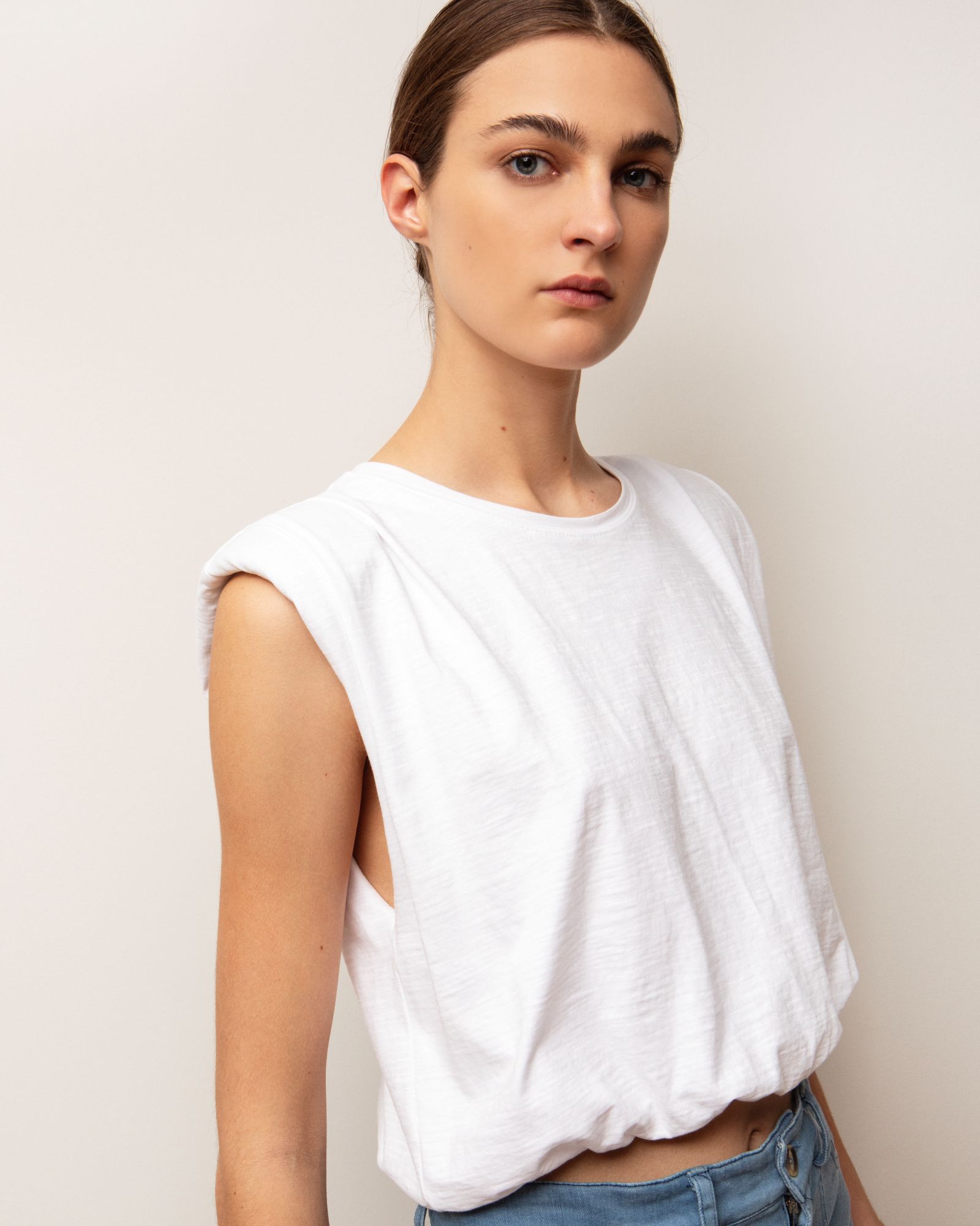 Αμάνικη μπλούζα λευκή με βάτες και ελαφριά πιέτα στο μπροστινό μέρος.