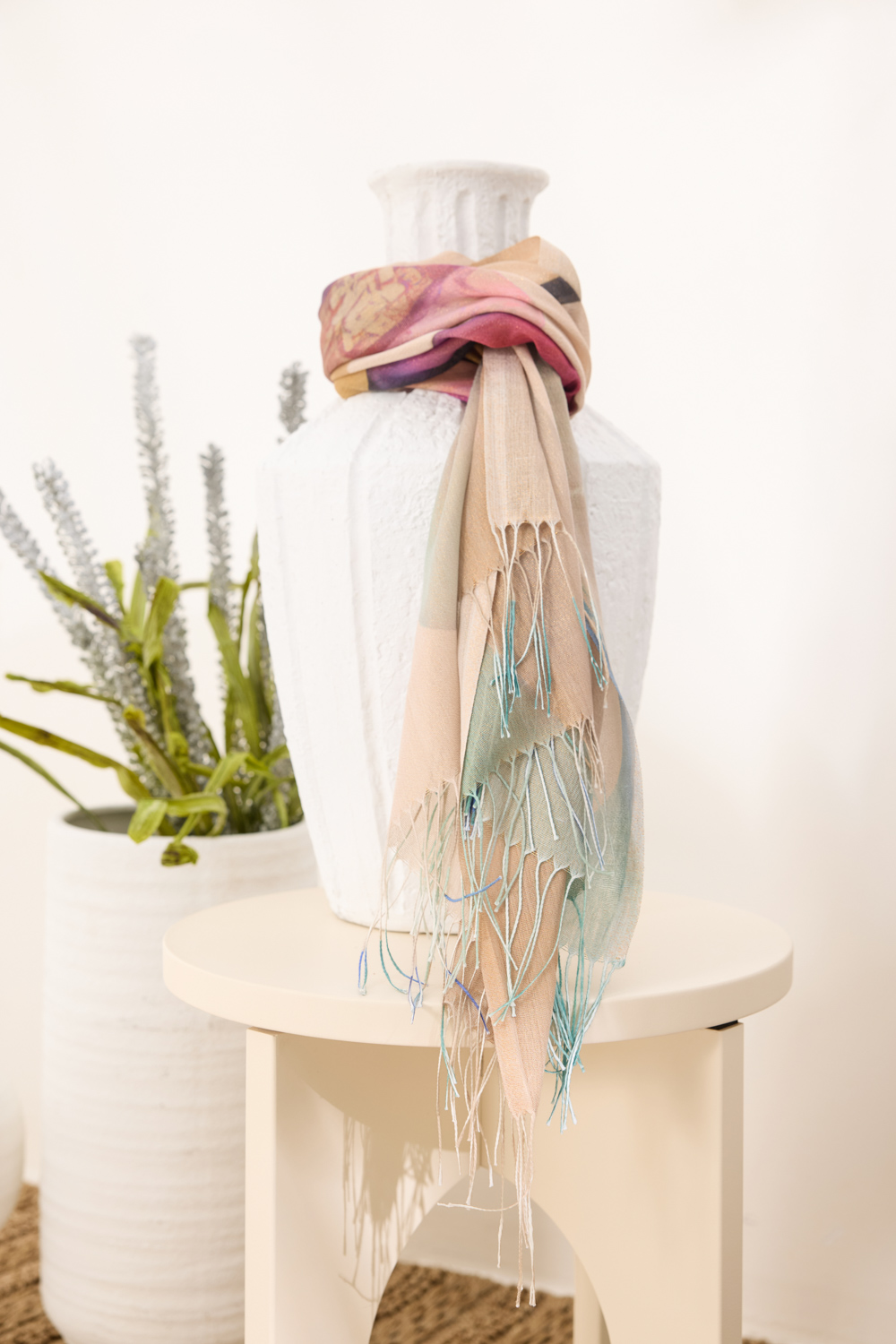 Φουλάρι με μήκος 1,80 m και πλάτος 0,90 m, από μείγμα viscose και cotton, με ιριδίζουσα υφή και διακριτική γυαλάδα. Το μεγάλο floral print , σε απαλά χρώματα, αναδεικνύει το σχέδιο, ενώ τα κρόσια στις άκρες ολοκληρώνουν το σύνολο με κομψή κίνηση.