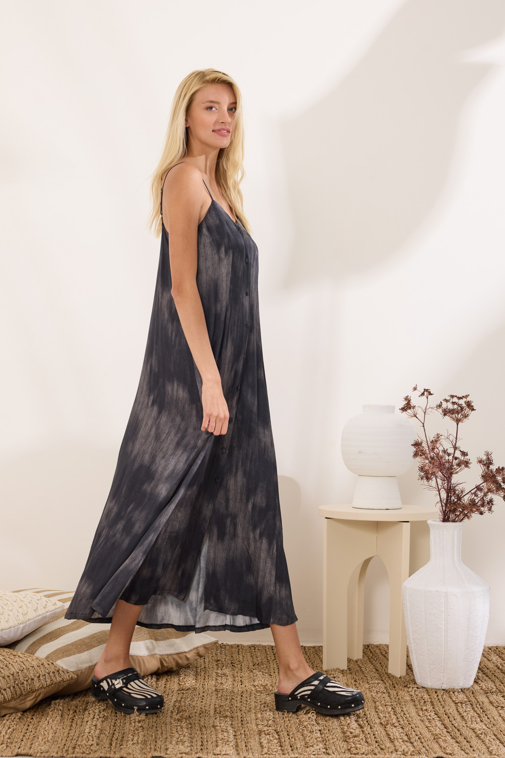 Φόρεμα μακρύ από 100% viscose με σατινέ υφή, που χαρίζει απαλή αίσθηση και κομψή κίνηση στο σώμα.