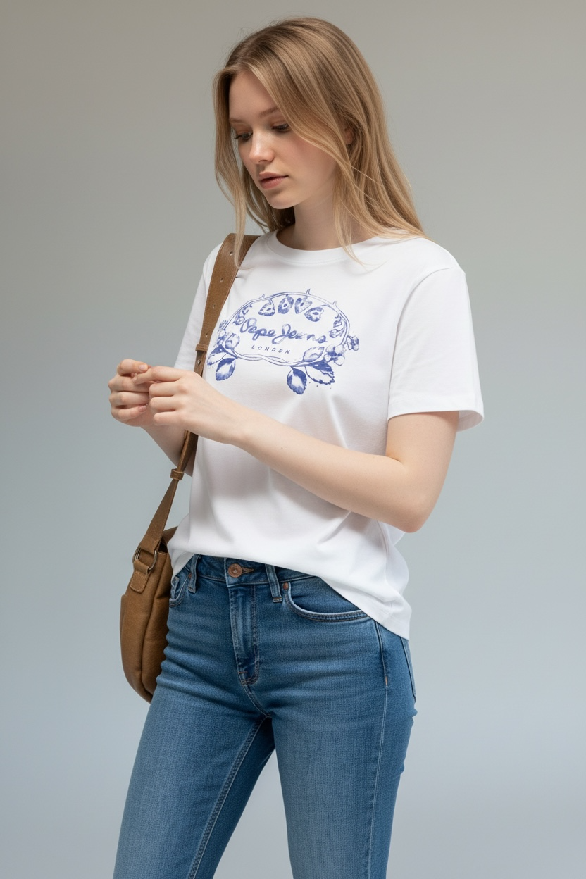 Μπλούζα λευκή με τύπωμα με φράουλες και λογότυπο Pepe Jeans. Κανονική εφαρμογή και στρογγυλή λαιμόκομψη.