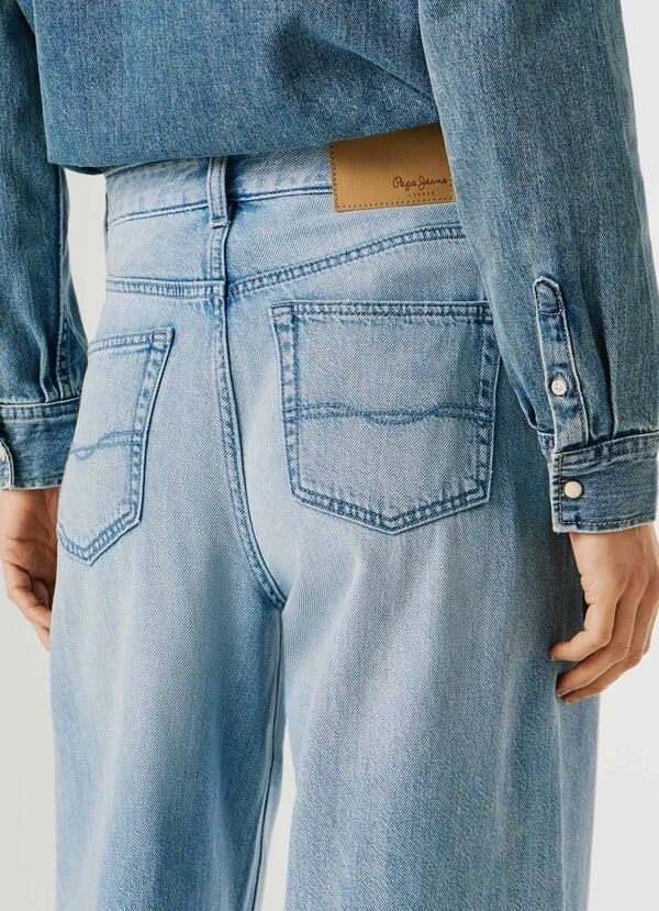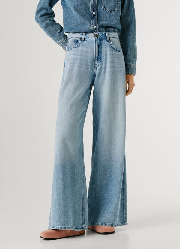 Ψηλόμεσο τζίν παντελόνι σε γαλάζια απόχρωση, στενό στο πάνω μέρος και πολύ άνετο μπατζάκι.