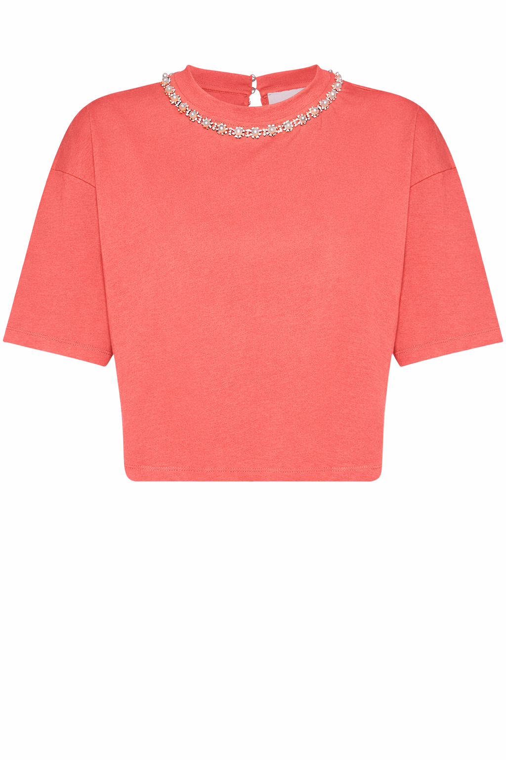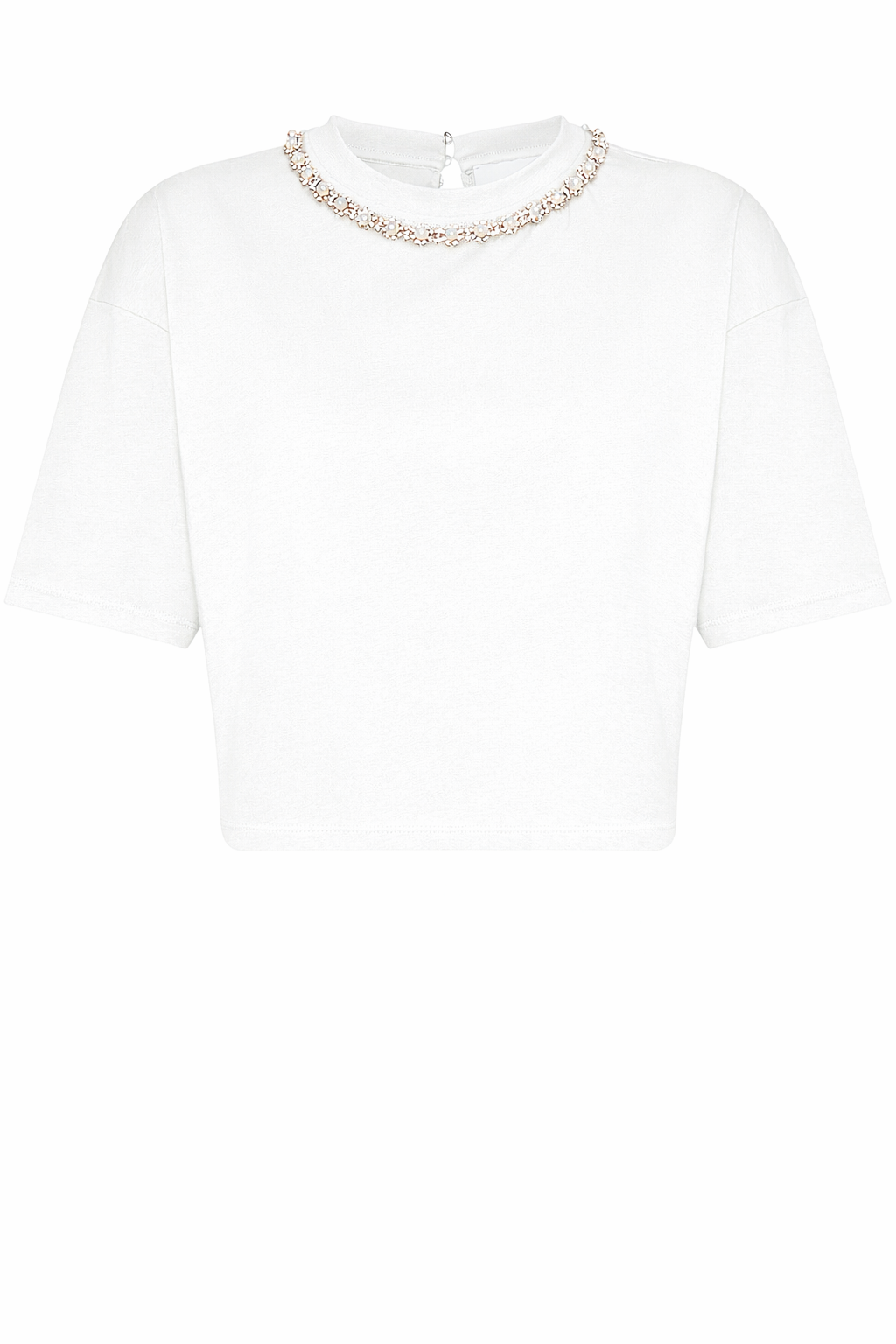 Γυναικεία μπλούζα crop κοντομάνικη, με στρογγυλή λαιμόκοψη που κλείνει με κουμπιά και διακοσμημένη με πέρλες και strass.