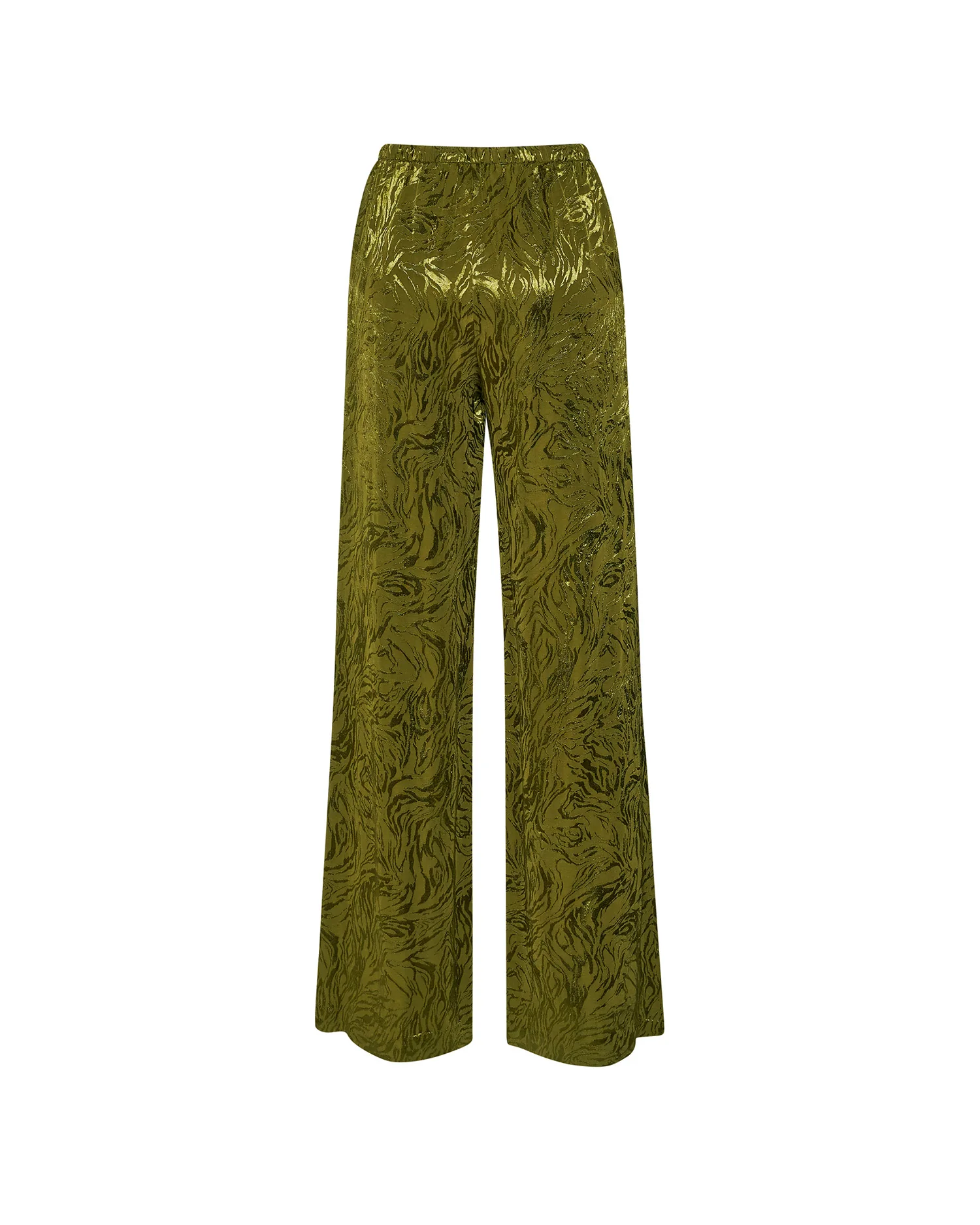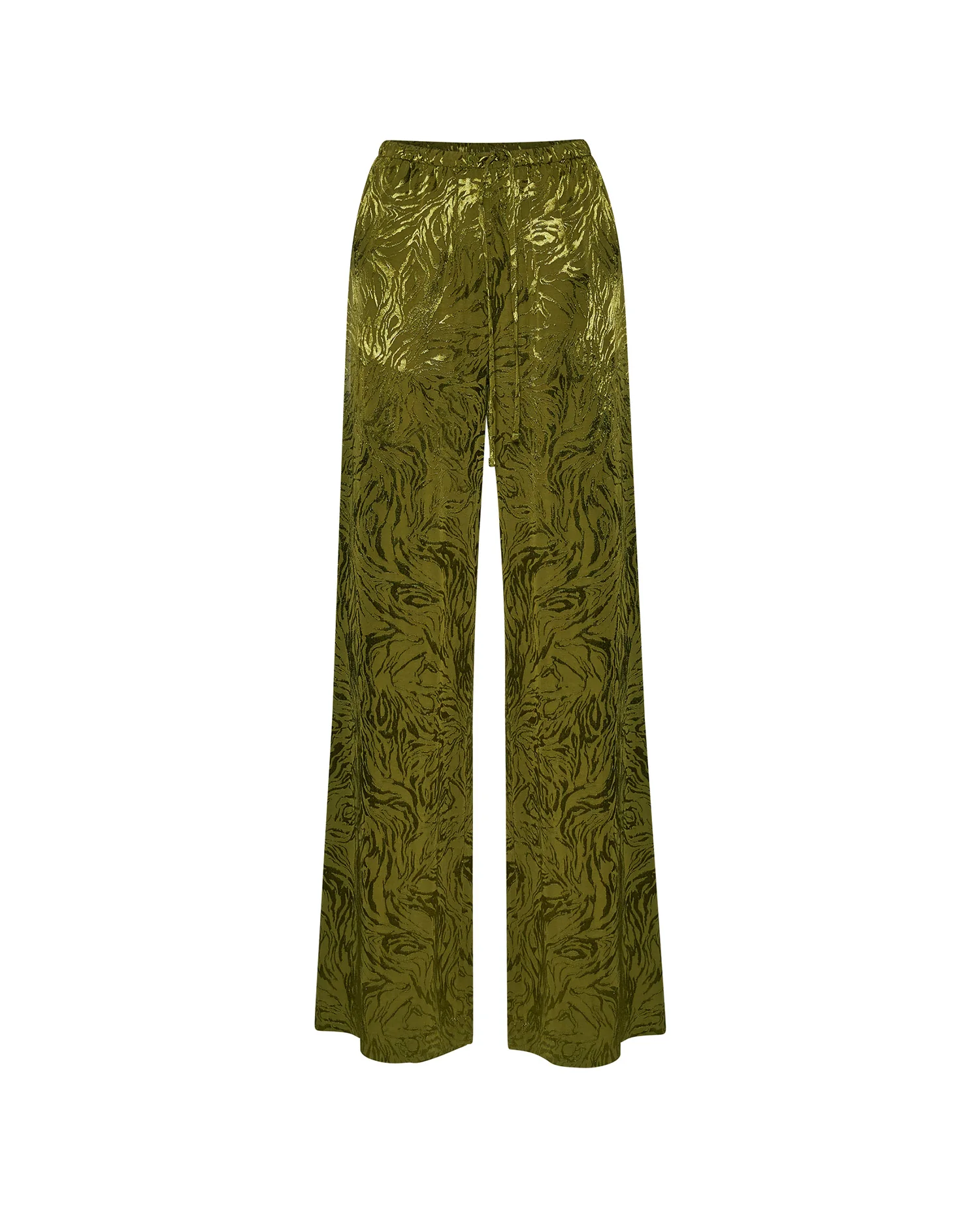 Σύνολο με σακάκι και παντελόνι με εμπριμέ ανάγλυφο σχέδιο σε πράσινο χρώμα. Το σακάκι με κρουαζέ κόψιμο και δέσιμο στο πλάι. Το παντελόνι σε άνετη γραμμή με κορδόνι στην μέση και τσέπες.