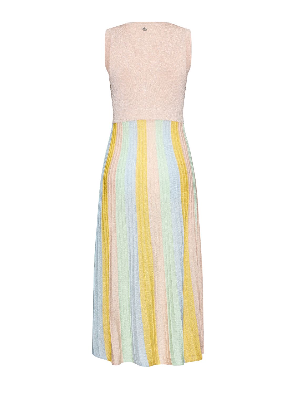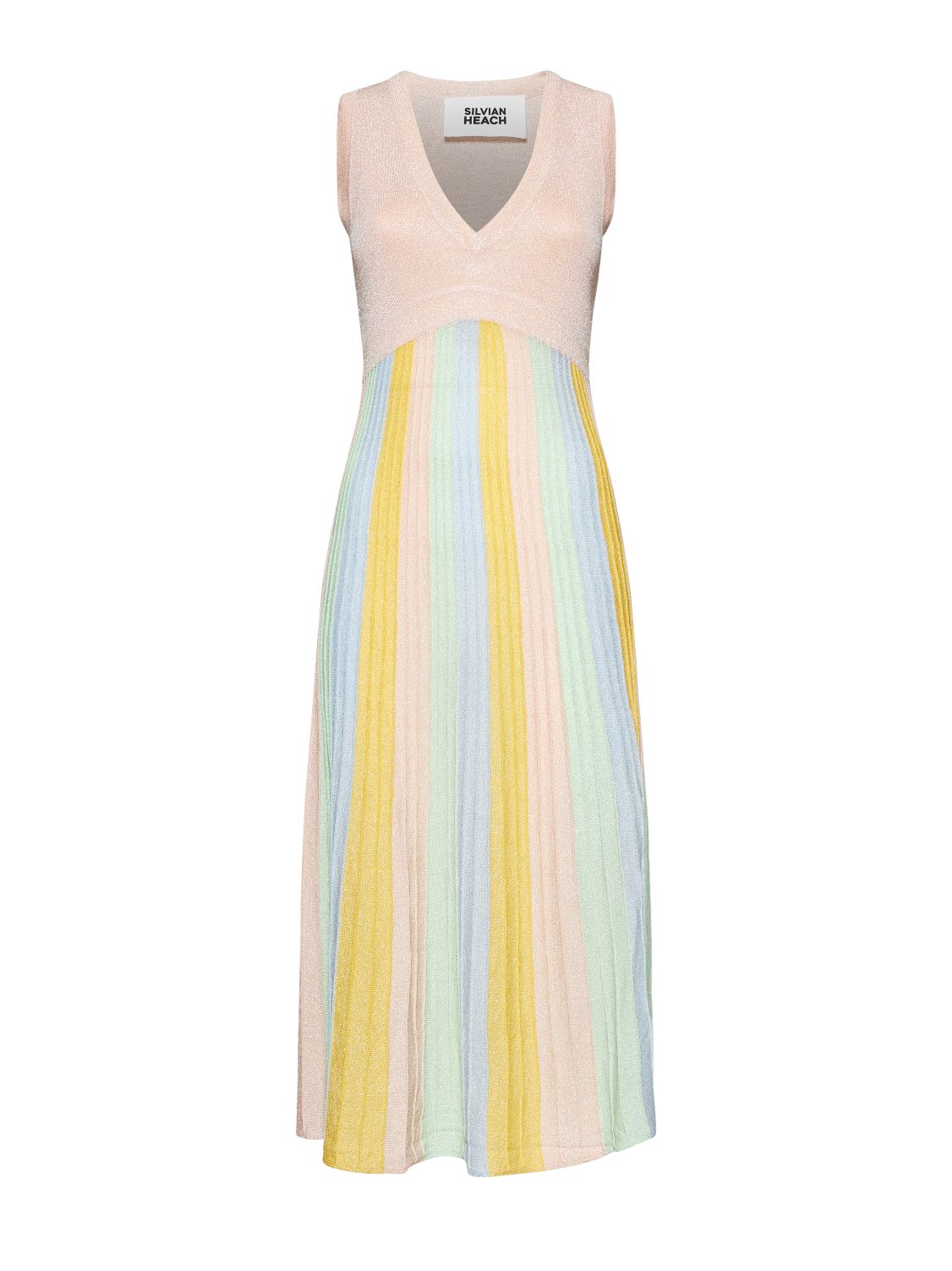 Πλεκτό φόρεμα με μεταλλική κλωστή. Αμάνικο με v λαιμόκοψη.