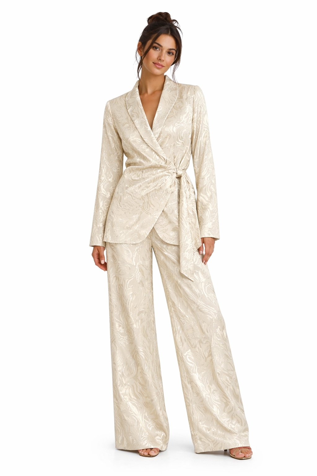 Σύνολο με σακάκι και παντελόνι με εμπριμέ ανάγλυφο σχέδιο σε μπεζ χρώμα. Το σακάκι με κρουαζέ κόψιμο και δέσιμο στο πλάι. Το παντελόνι σε άνετη γραμμή με κορδόνι στην μέση και τσέπες.