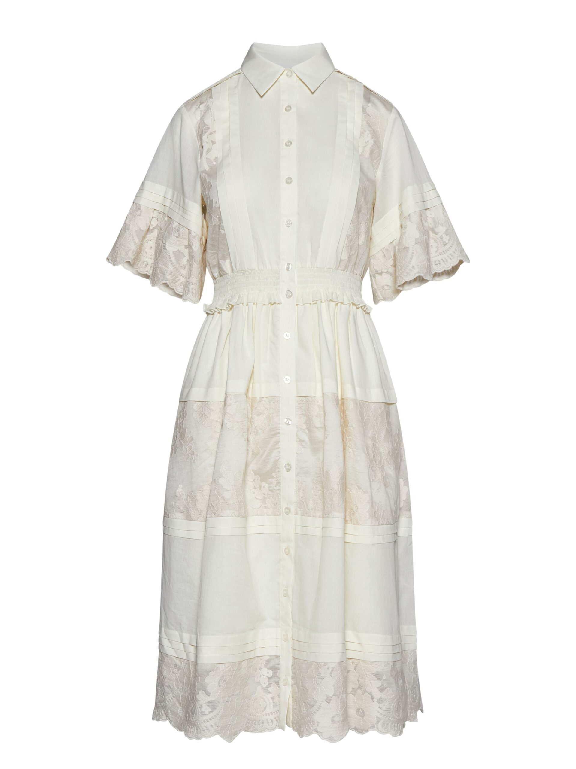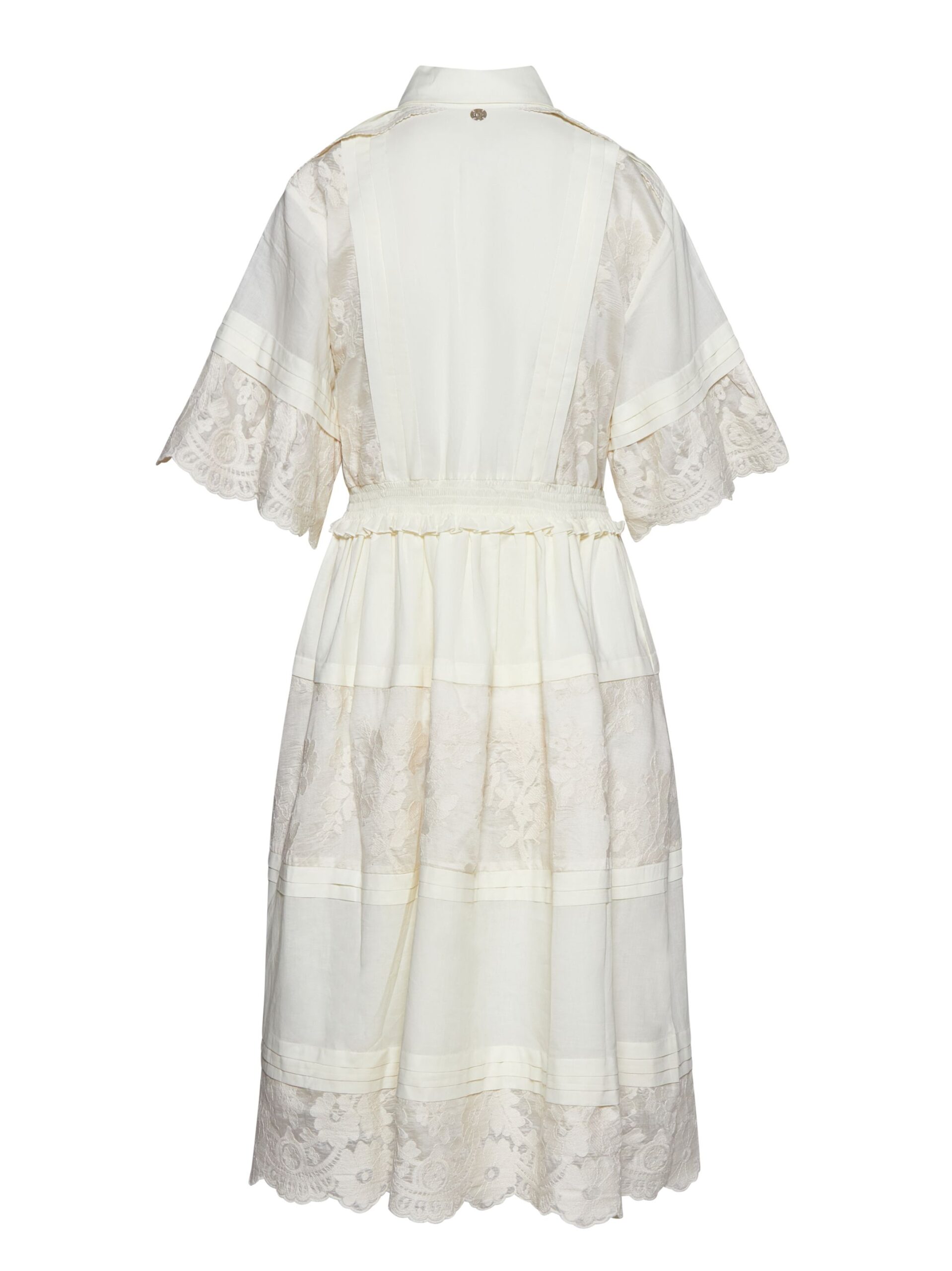Φόρεμα κοντομάνικο με γιακά σε κοντό μήκος. Εμπλουτισμένο με διακριτικές δαντελένιες λεπτομέρειες και πρακτικά κουμπιά.